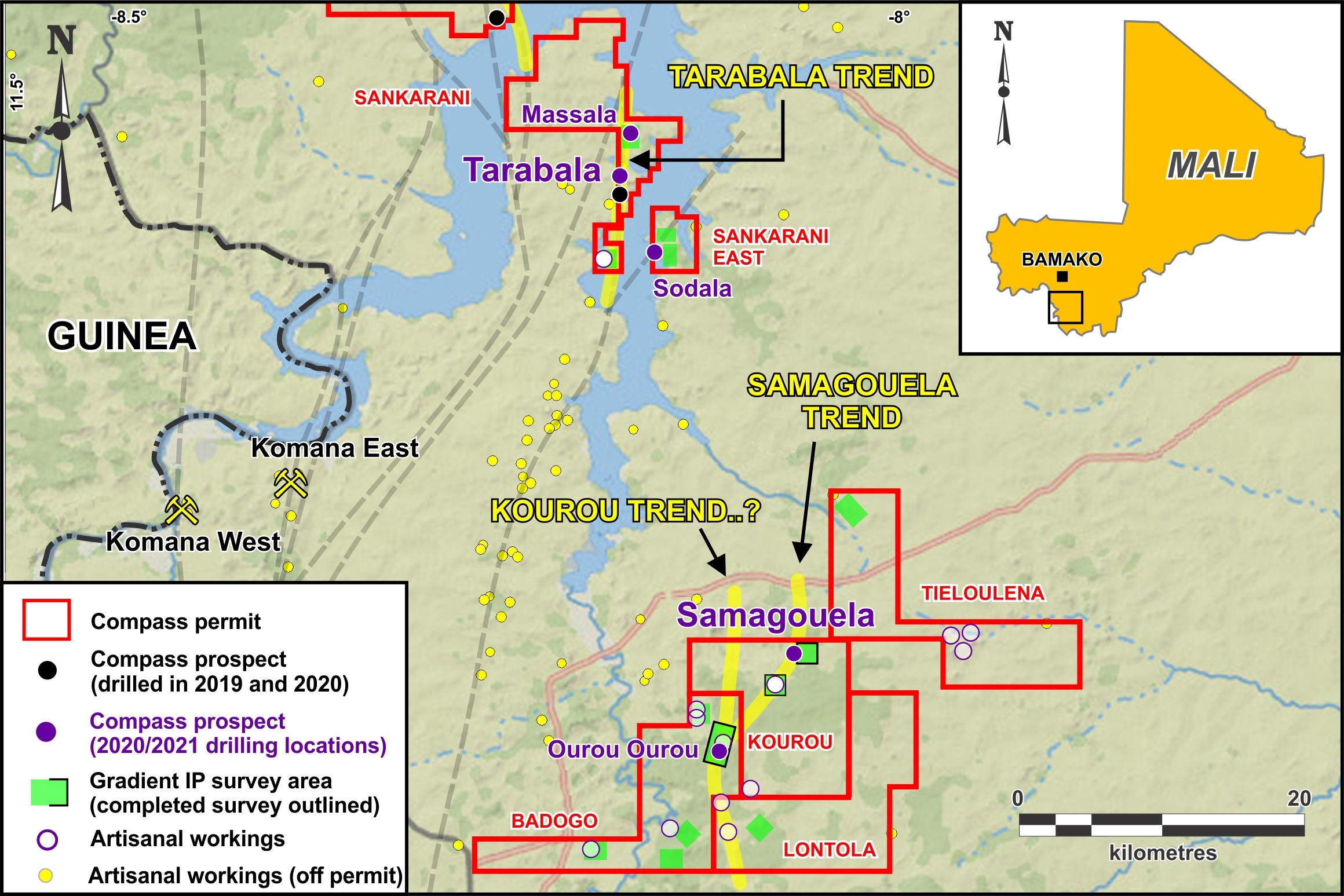 Compass CEO, Larry Phillips, said, “Preparations continue on our primary drilling targets on the Tarabala and Samagouela trends. Our field team has appraised site access and a bulldozer will be on site early next week to prepare the drilling pads for our initial 3,000 m air core drilling program there. Based on the success of our drilling earlier this year, we will be testing a 2.3-km zone on the 10 km Tarabala Trend, and a 1.4-km zone on the 10 km Samagouela Trend. The current program will provide additional information on the continuity of the previous near surface mineralized intercepts, such as 14 m @ 2.75 g/t Au and 9 m @ 5.79 g/t Au from Samagouela, and follow the mineralization along strike. Drilling in both areas will be completed before the end of the year. These results, along with the recently completed geophysical surveys, will help define precise drilling targets to be followed-up next year.”