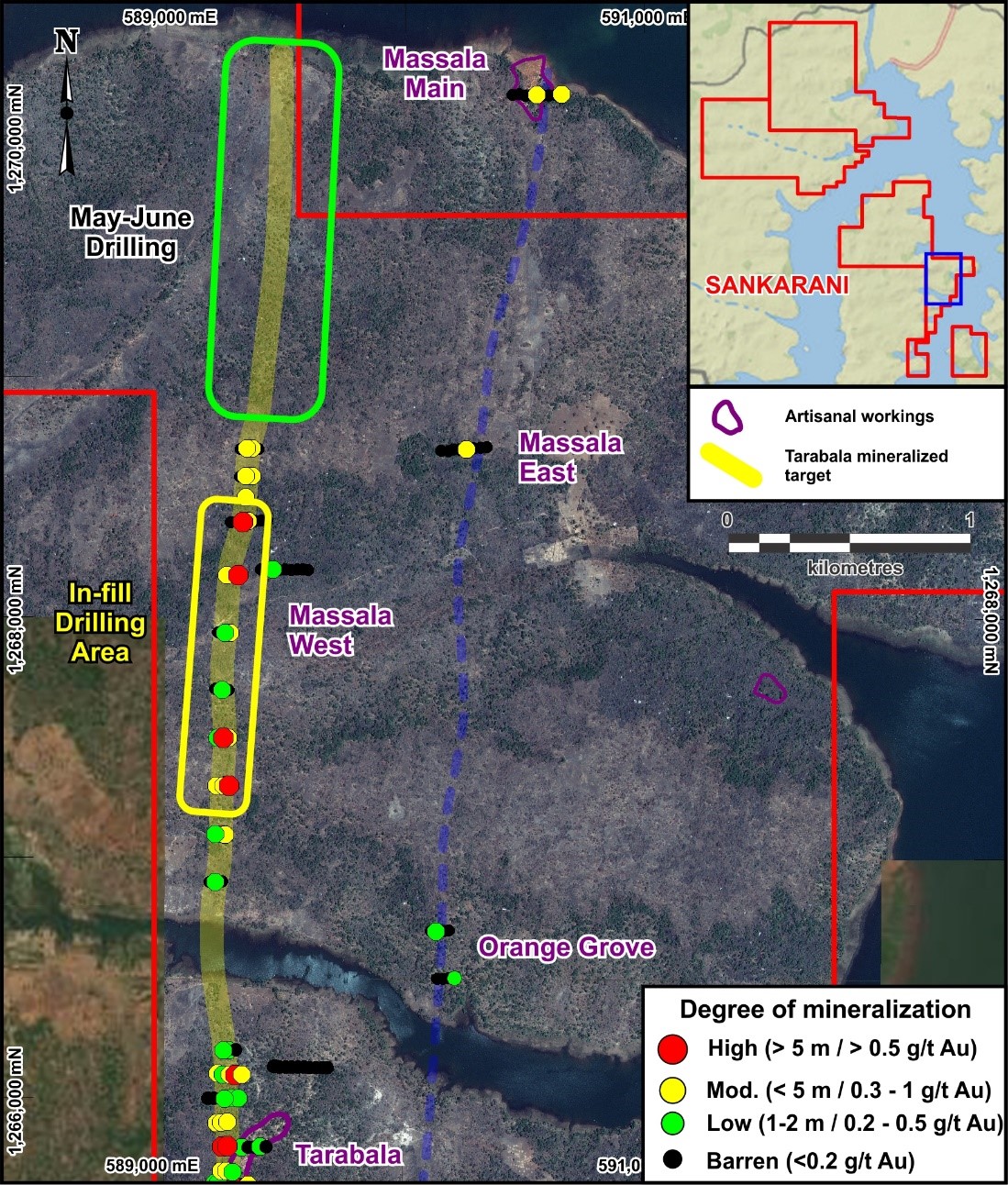 - Drilling at the Massala Main, Orange Grove, and Assama artisanal workings did not intercept significant mineralization