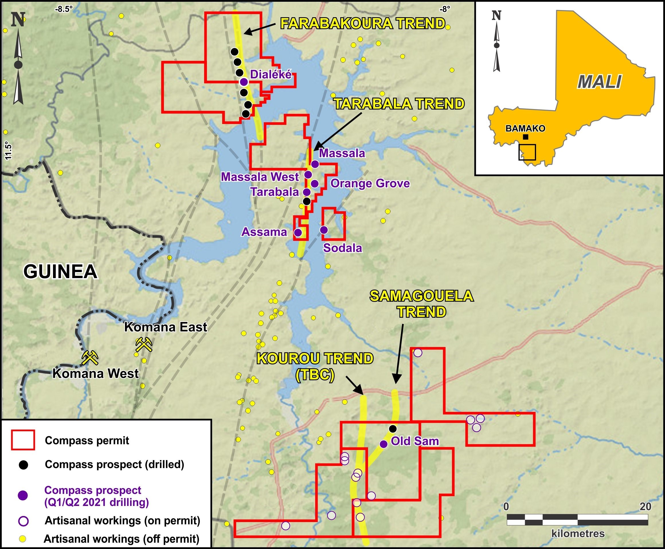 Assay results are pending from 1,412 m of AC drilling at the Dialéké prospect (Faraba-Coura permit), and 889 m of drilling at the Old Sam prospect (Kourou permit). Ongoing in-fill shallow soil sampling and ground geophysics are continuing on other parts of the Sikasso property, and Compass’s technical team is continually appraising and identifying new targets.