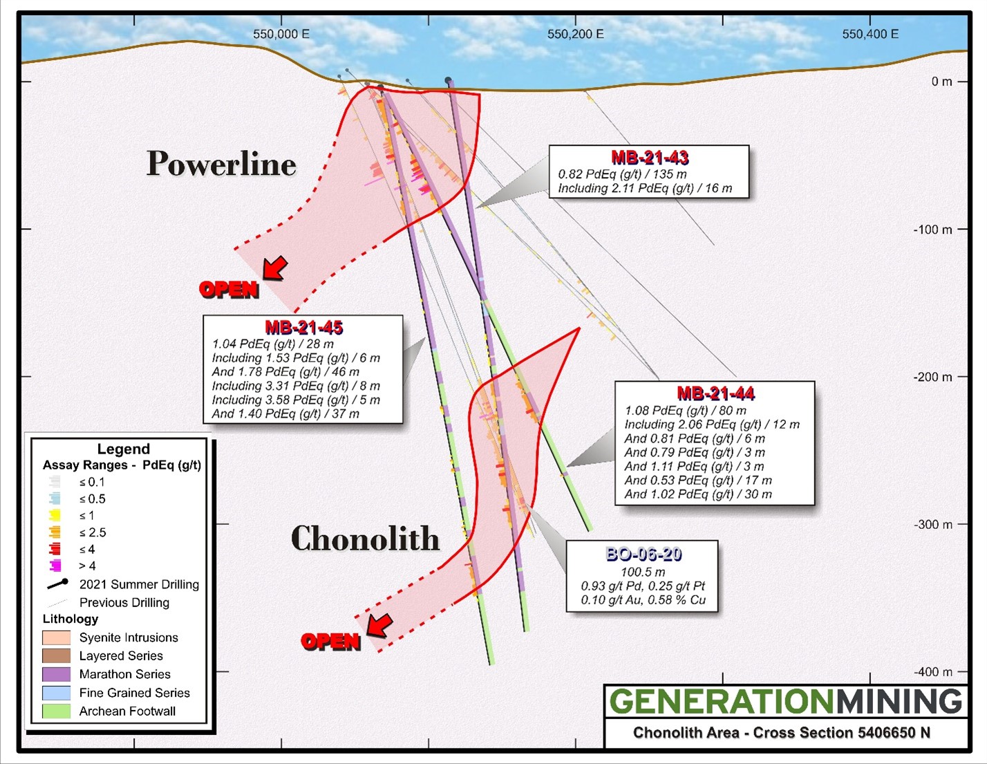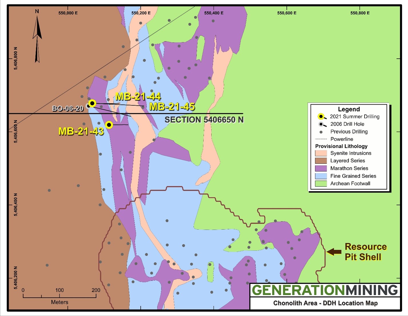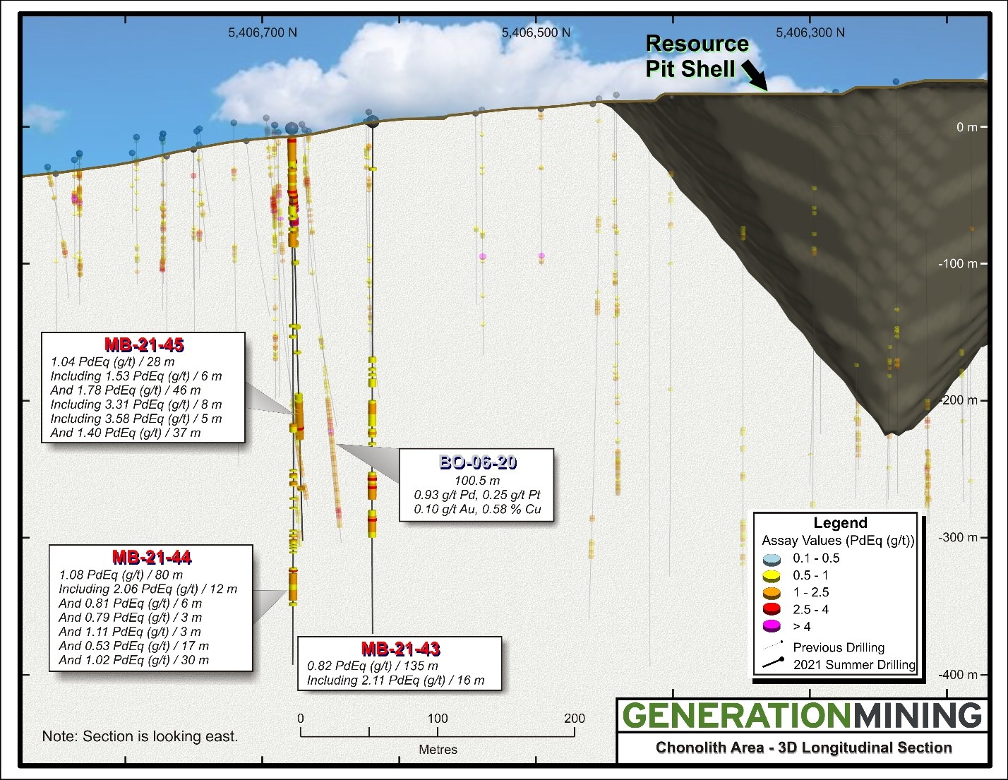 TORONTO, Sept. 02, 2021 (GLOBE NEWSWIRE) -- Generation Mining Limited (TSX: GENM; OTCQB: GENMF) (“Gen Mining” or the “Company”) is pleased to announce results from the first three holes drilled in the Chonolith area immediately north of the Marathon palladium-copper deposit in Northwestern Ontario. The Company completed a positive feasibility study (see March 3rd, 2021 news release) which contemplates the development of an open-pit mining operation with robust project economics over a 13-year mine-life. As with recently completed work on the Central Feeder Zone (see 2021 news releases of January 25th, May 10th and August 17th), current exploration activities are focused on evaluating the potential for additional resources which could, in the future, potentially extend the life of the proposed operation.