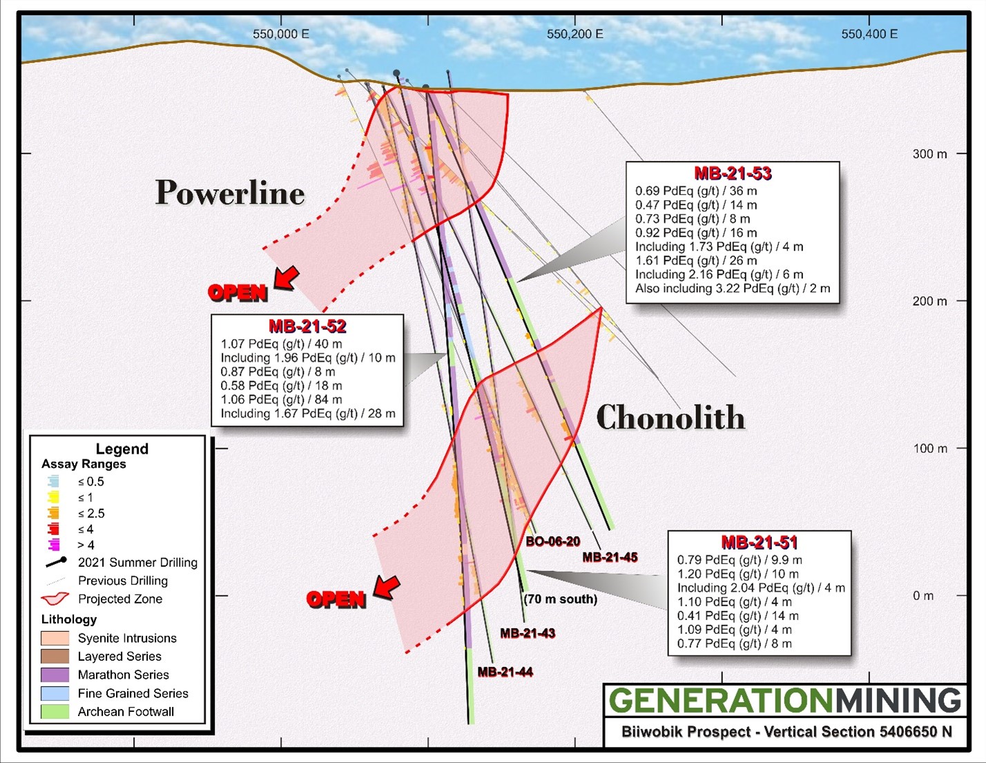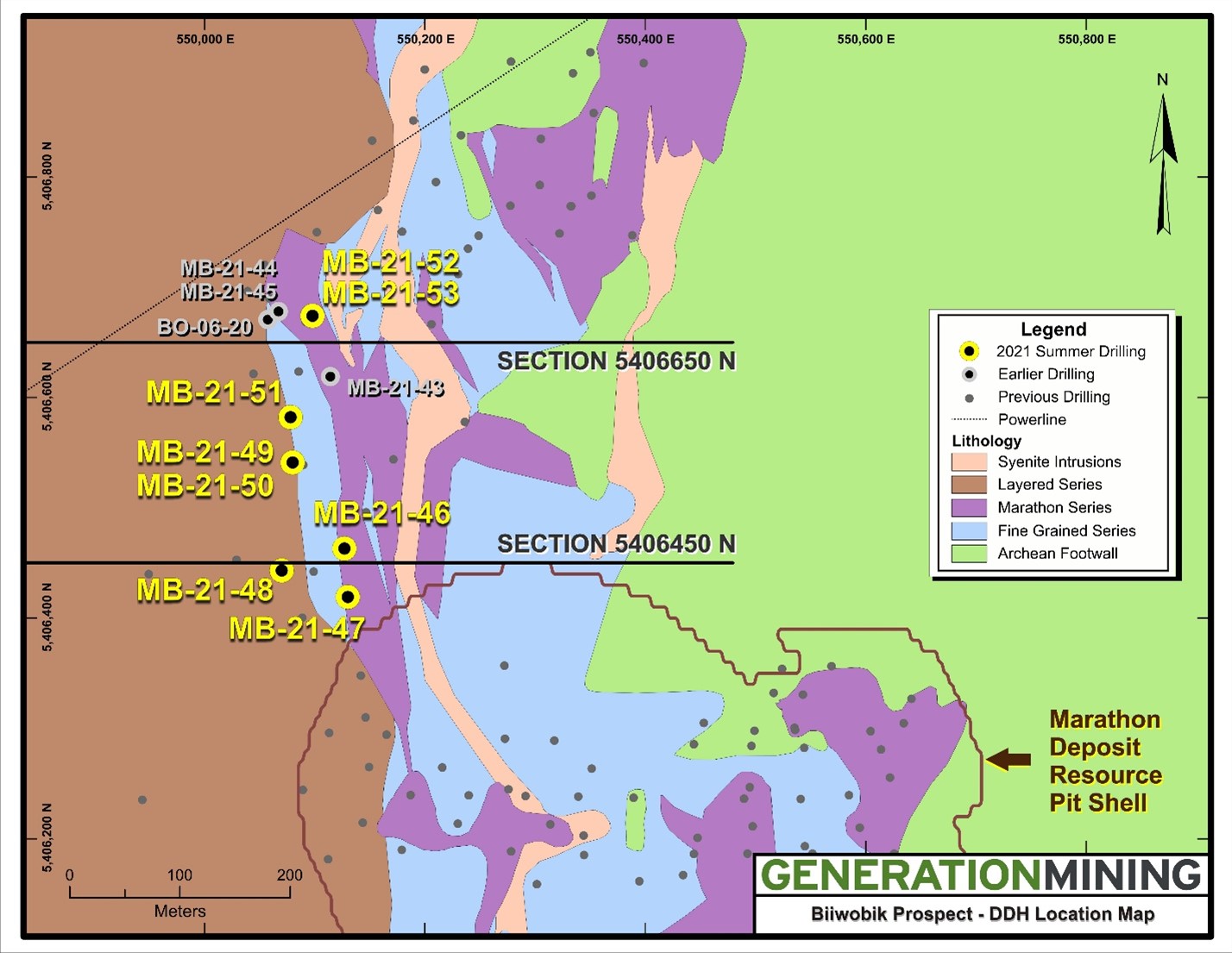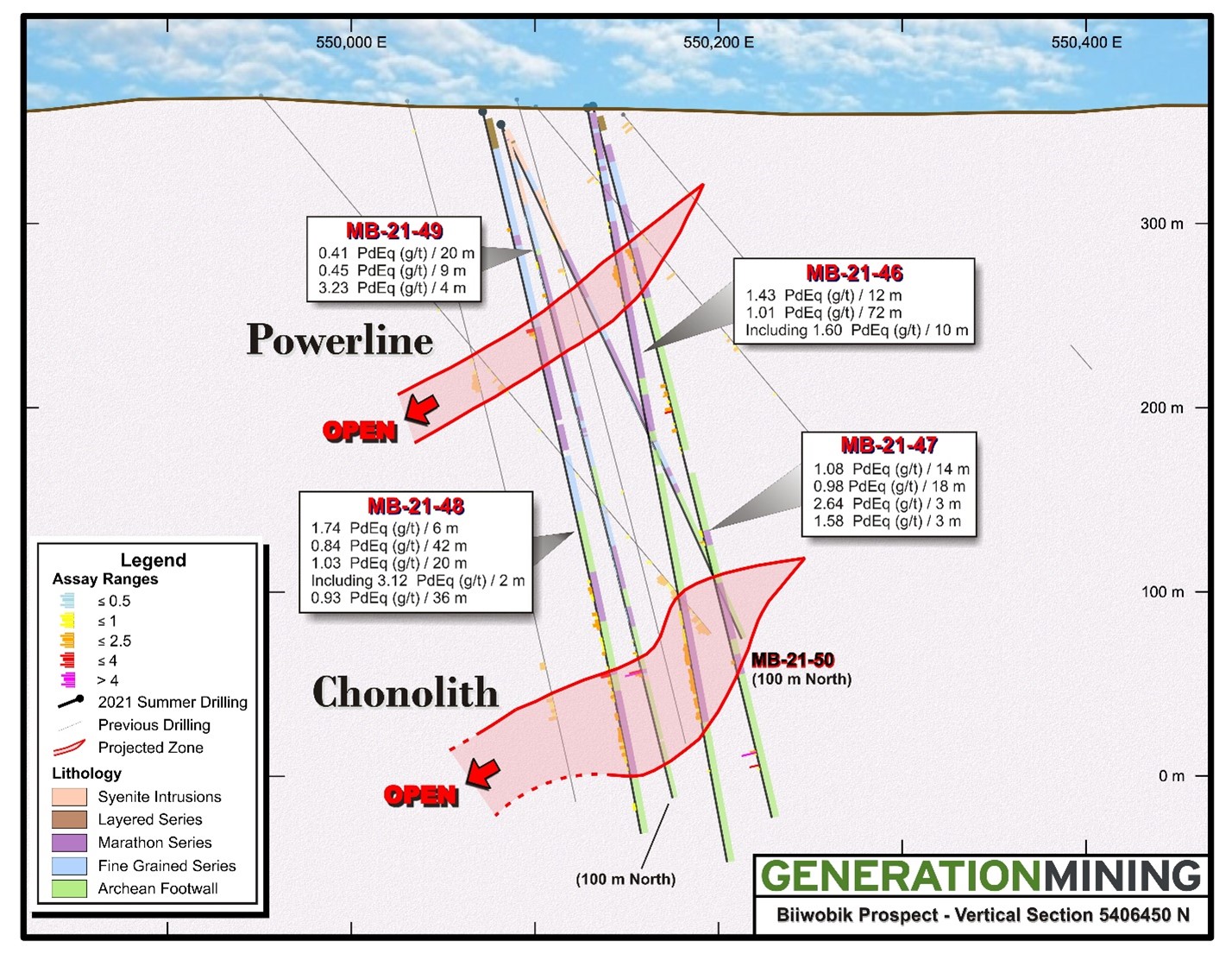 TORONTO, Nov. 08, 2021 (GLOBE NEWSWIRE) -- Generation Mining Limited (TSX: GENM; OTCQB: GENMF) (“Gen Mining” or the “Company”) is pleased to announce results from the remaining eight holes drilled this summer in the Chonolith and Powerline zones at the Biiwobik Prospect, situated immediately north of the Marathon palladium-copper deposit in Northwestern Ontario. The Biiwobik Prospect name originates from the Biigtigong Nishnaabeg’s First Nation dialect of the Nishnaabe language meaning “metal”.