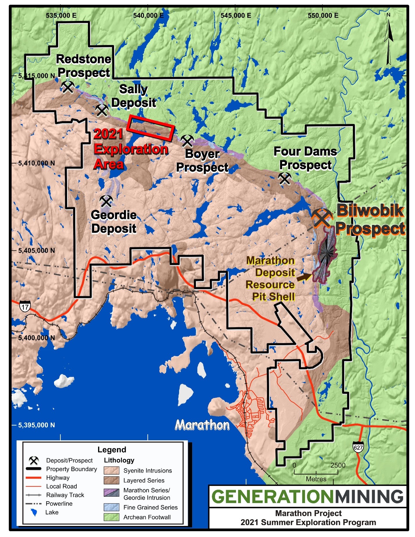 Gen Mining’s focus is the development of the Marathon Project, a large undeveloped platinum group metal mineral deposit in Northwestern Ontario. The Company released the results of the Feasibility Study on March 3, 2021 and published the NI43-101 Technical Report dated March 25, 2021. The Marathon property covers a land package of approximately 22,000 hectares, or 220 square kilometres. Gen Mining currently owns an 82.6% interest in the Marathon Project, with the remaining interest owned by Sibanye-Stillwater.