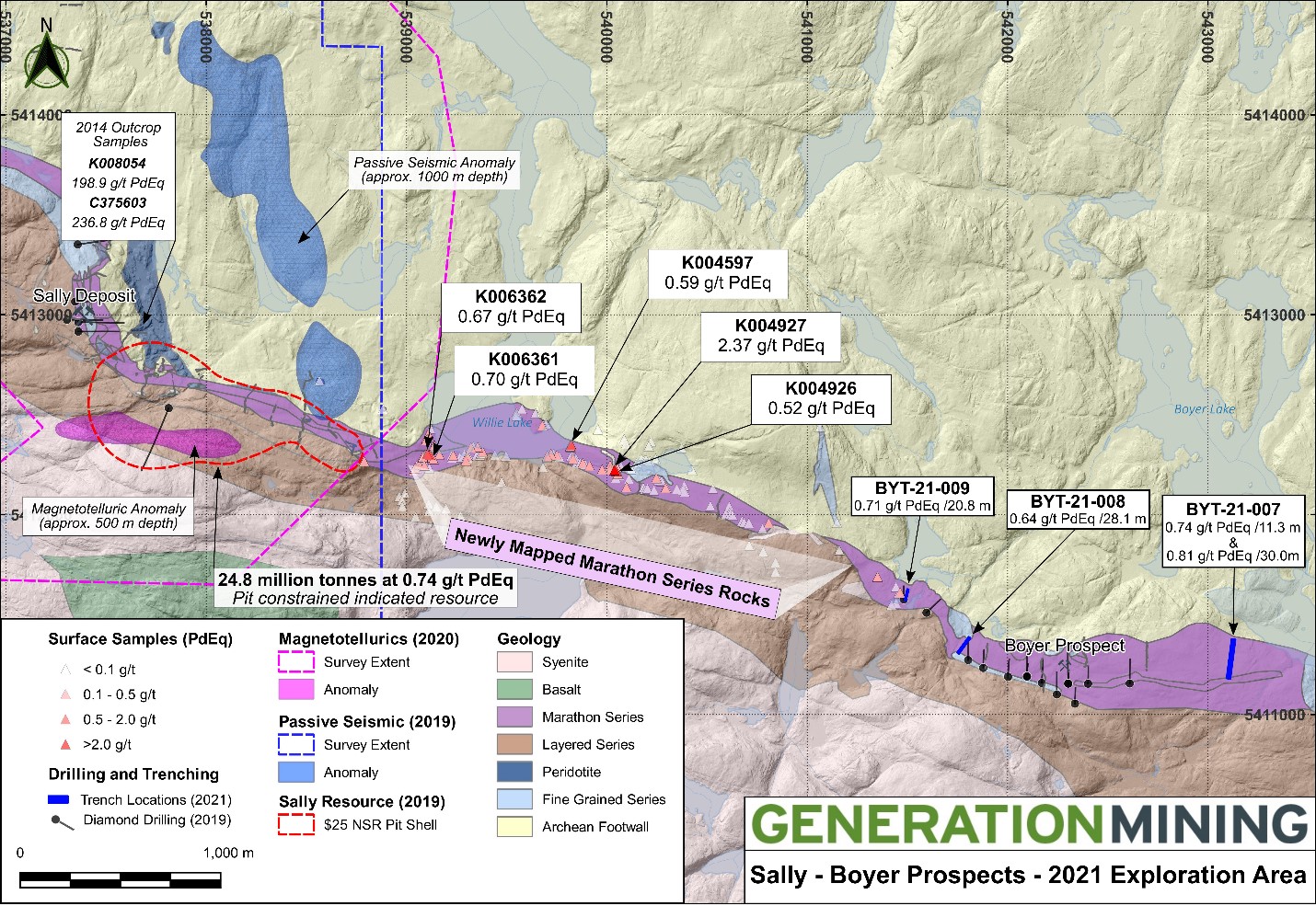 Trenching results have expanded the mineralized zone at Boyer to a 1.6 km strike length. The relatively low Cu/Pd ratio at Boyer suggests the Boyer Prospect has origins similar to the high-grade W-Horizon at the Marathon Deposit and consequently it remains an exploration area of interest going forward.