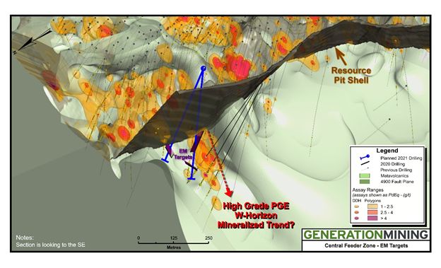 Gen Mining intends to start its summer drilling program on or about May 15th, 2021. The initial phase of the summer program will test two off-hole electromagnetic conductors as shown in Figure 4 which may be in response to massive sulphide accumulations on the floor of the Central Feeder Zone. These conductors are located approximately 50 to 120 metres east and up-dip from the mineralized intercepts in the recently drilled holes shown in Figures 2 and 3. These conductors may be of the same origin as the 16-metre interval of net textured to massive sulphides intersected in hole M-20-543 (see news release of October 29th, 2020).