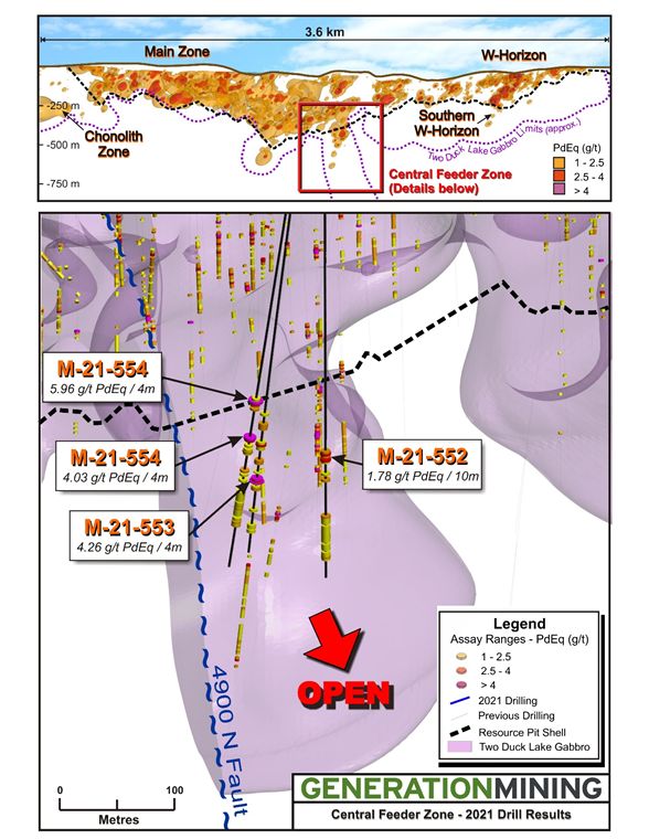 TORONTO, May 10, 2021 (GLOBE NEWSWIRE) -- Generation Mining Limited (TSX: GENM; OTCQB: GENMF) (“Gen Mining” or the “Company”) is pleased to announce results from the winter drill program of targets immediately adjacent to the Marathon palladium-copper deposit in Northwestern Ontario. The Company recently completed a positive feasibility study (see March 3rd, 2021 news release) which contemplates the development of an open-pit mining operation with robust project economics over a 13-year mine-life. Current exploration activities are focused on evaluating the potential for high grade, ramp accessible resources which could, in the future, potentially extend the life of the proposed operation.
