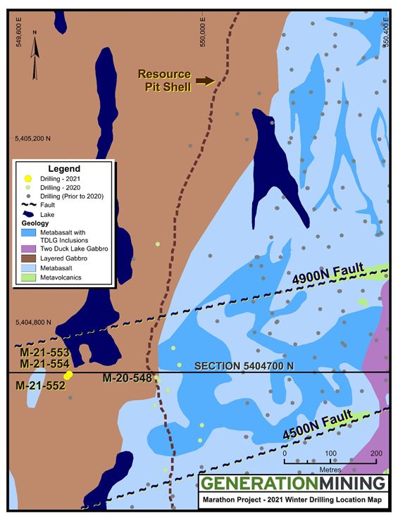 Figure 1: Western margin of Marathon Palladium Deposit – Central Feeder Zone Area showing 2021 Winter Drilling collar locations (M-21-552 to 554, inclusive) and the location of Cross Section 5404700N. The location of 2020 Hole ML-20-548 (see January 5th, 2021 news release) is also shown for reference purposes.