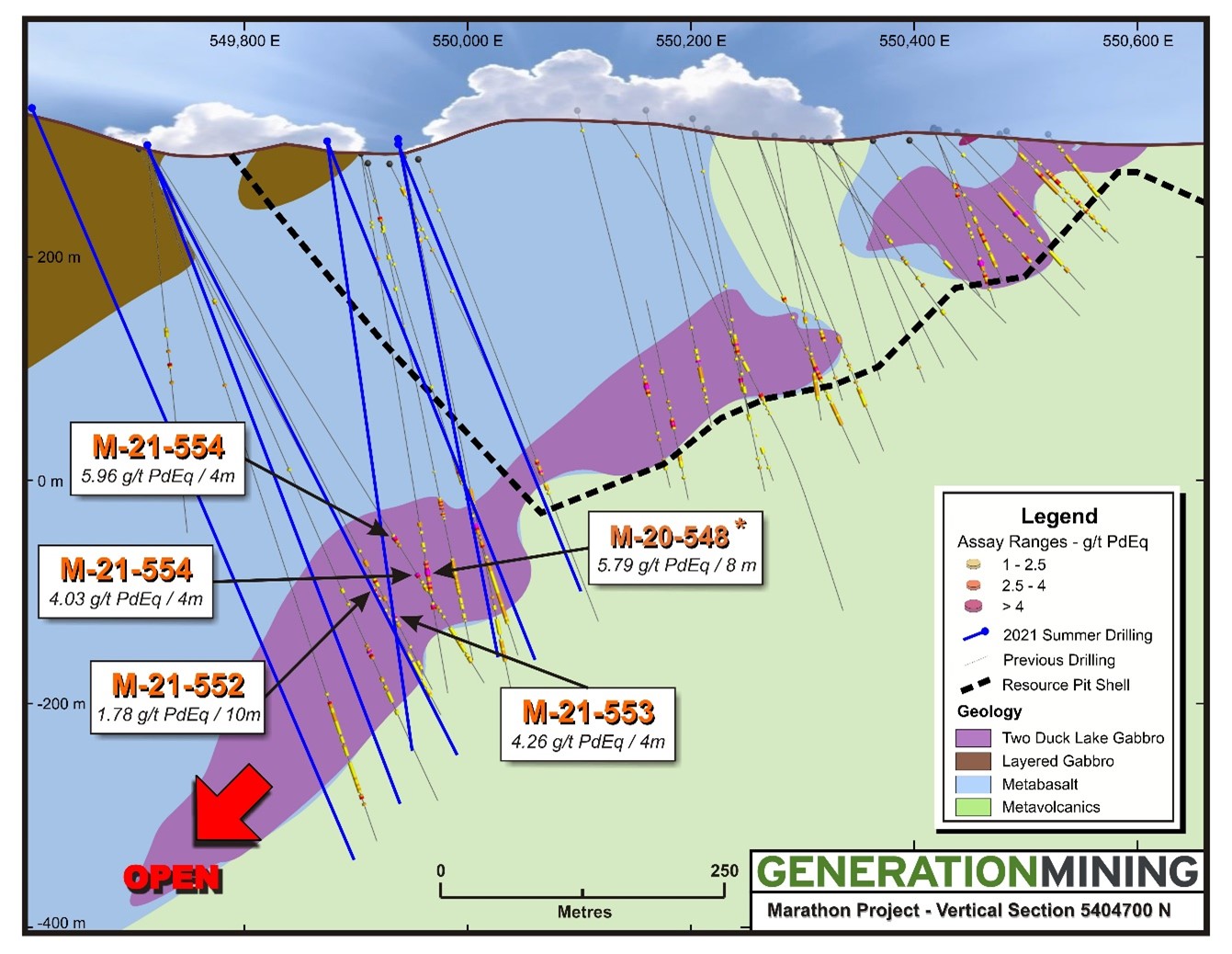 Figure 3: Cross Section 5404700N through the Marathon Deposit and Central-Feeder Zone area showing location of the proposed summer 2021 drill holes. *The Palladium Equivalent (“PdEq”) calculation expressed in g/t is the sum of the theoretical in situ value of the constituent metals (Pd+Pt+Au+Cu) divided by the value of one gram of palladium. The calculation makes no provision for expected metal recoveries or smelter payables. Please note the PdEq calculation for results shown for hole M-20-548 drilled in 2020 was based on USD commodity prices of $1,275, $900, and $1,300 per ounce for Pd, Pt and Au and $3.00/lb for Cu. These prices are less than the commodity prices used to calculate PdEq values for 2021 holes ML-21-552 to 555, inclusive which were USD commodity prices of $1,725, $1,000, and $1,400 per ounce for Pd, Pt and Au and $3.20/lb for Cu.
