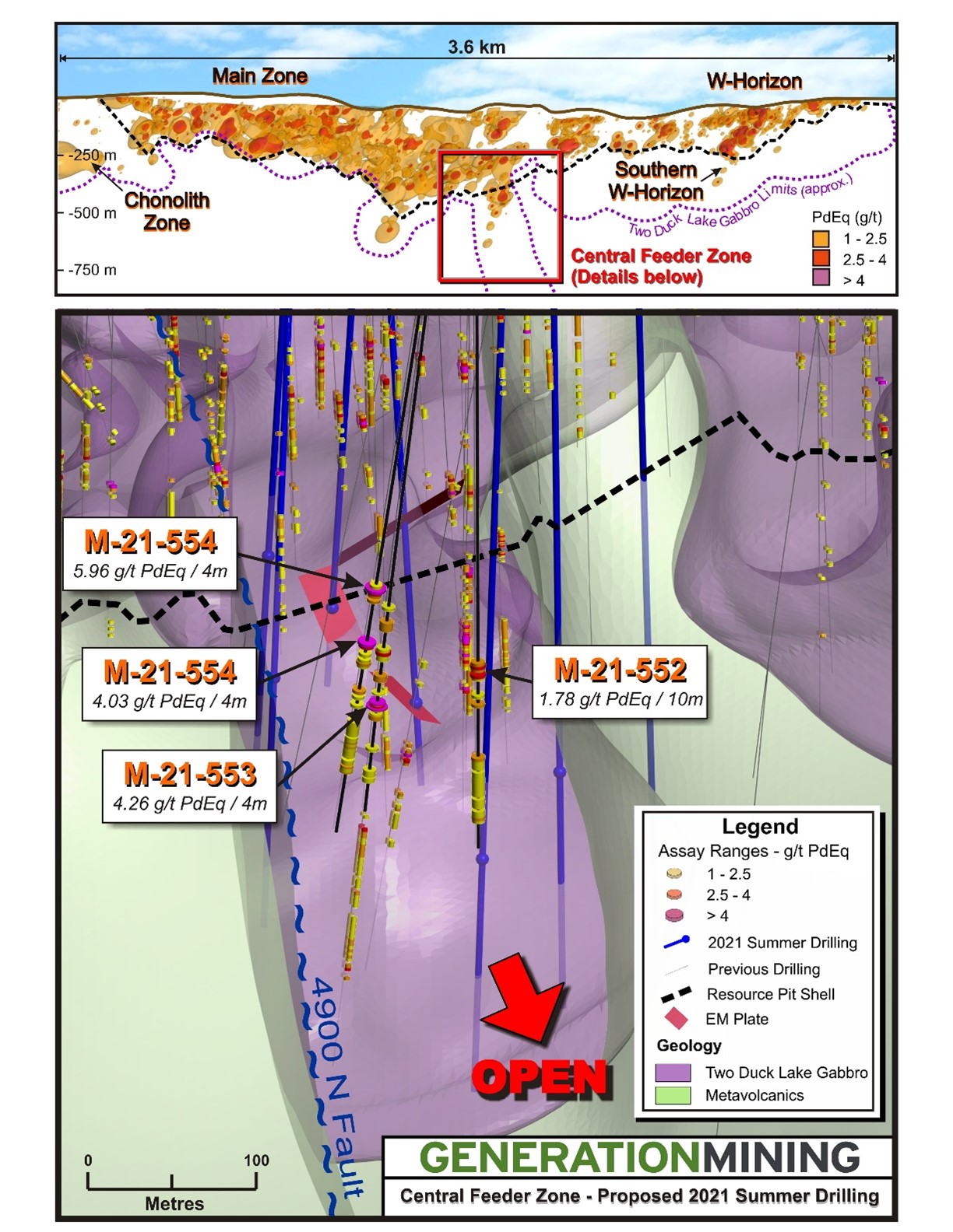 Drilling recommenced on May 15th, 2021 and is focused initially on the W-Horizon extension in the Central Feeder Zone area (Figures 1-4, inclusive) where the Company reported on multiple high-grade intercepts, including up to 4.3 g/t Pd, 0.81 g/t Pt, 0.48 g/t Au and 0.63% Cu over 4-metres, in its May 10th, 2021 news release. A total of seven holes for 4,000 m are planned for the Central-Feeder Zone area this summer. Two holes will test two off-hole electromagnetic conductors, as shown in Figure 4, which may be in response to massive sulphide accumulations on the floor of the Central-Feeder Zone. Five additional holes will test the width and down plunge extent of the previously reported (May 10th, 2021) high-grade drill intercepts.