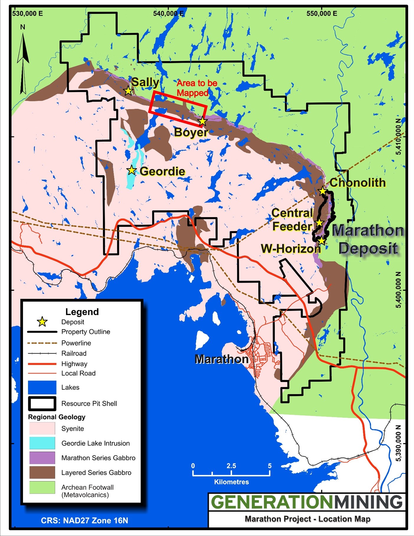 Figure 1: Marathon Project Location Map showing location of the Marathon Deposit, Sally Deposit and Boyer Prospect, Central-Feeder and Chonolith zones as well as the area to be mapped and prospected during the Summer of 2021.
