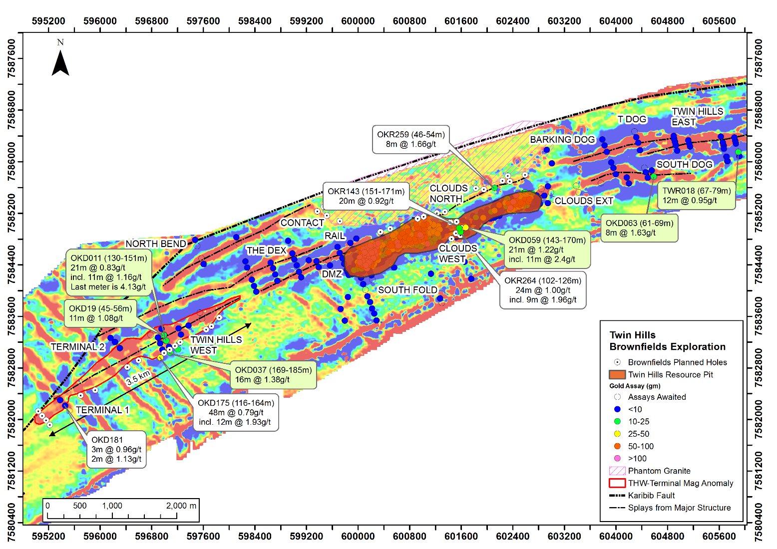 In addition, a third positive hole was returned from Clouds West adjacent to the Twin Hills Central (“THC”) orebody and the current thinking is that although this is a small, south-faulted block of mineralization, it does extend the mineralization previously discovered at Clouds West (OKD059: 27m @ 1.22g/t).