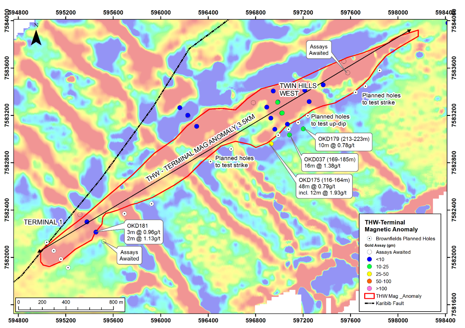 - OKD175 – 48m @ 0.79g/t (116-164m) incl. 12m @ 1.93g/t (Twin Hills West (“THW“))
