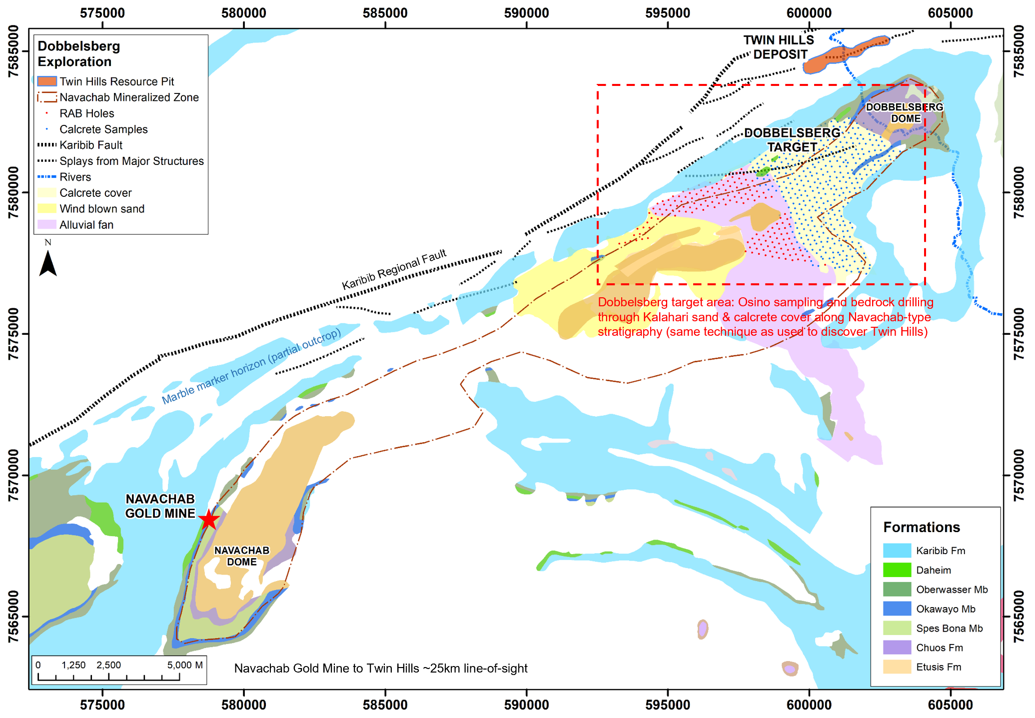 - New, large-scale calcrete sampling exercise underway along strike extension of Navachab Gold Mine stratigraphy at Dobbelsberg Dome 5km south of Twin Hills
