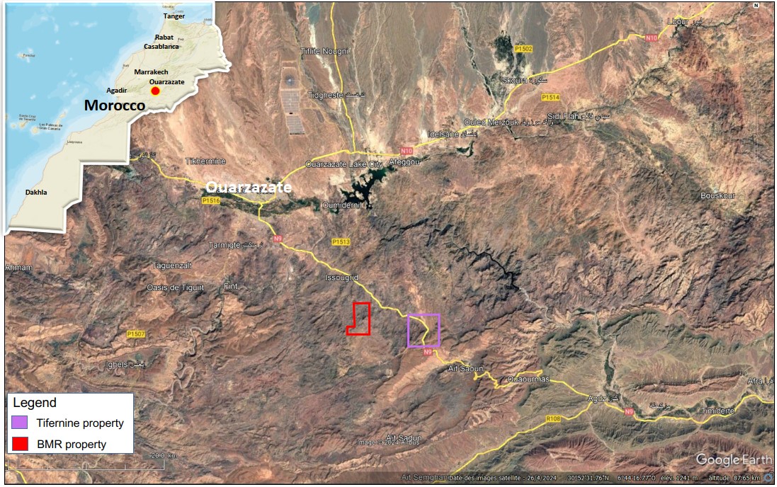 The Tifernine Copper Project covers an area of approximately 16 km² (see Fig. 1) and is located southeast of Ouarzazate, Morocco, accessible via the national road N9, which connects Ouarzazate to Zagora. The property is situated just 10 km from the BMR property, where Genius Metals also holds an option to acquire a 100% interest (see press release dated July 11, 2024).