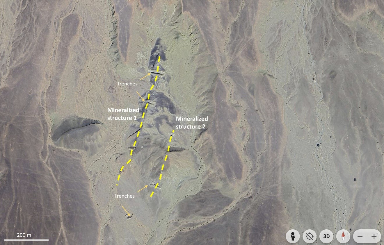 The Timarighine property lies within an east-west trending depression on the southern front of the Precambrian-aged Saghro massif. Copper mineralization occurs along two parallel vein structures, known locally as "iron cap" zones, marked by extensive alteration zones with hematite and goethite iron oxides. The mineralized structures are characterized by a shear system oriented NNE-SSW and feature local stockwork zones of brecciated carbonate-quartz-pyrite-chalcopyrite veinlets. The two main mineralized veins extend approximately 650 meters and 300 meters in length, with variable widths up to 5 meters (Figure 1: Aerial View of Main Mineralized Structures). High-grade copper identified within these zones also hints at significant primary sulfide mineralization potential at depth, underscoring Timarighine’s status as a high-value copper exploration target.