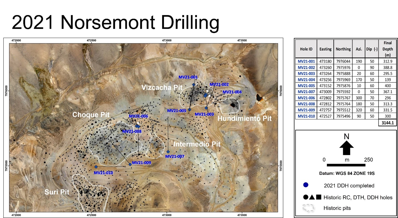 John Currie, Norsemont’s VP of Exploration states “We are very pleased to have encountered high grade gold mineralisation at surface from these first two diamond drill holes. The presence of high-grade zones was also indicated by re-assaying of historic core from the Vizcacha Pit. These are excellent preliminary results in line with our expectations and we look forward to sharing more results with the market as they arise.”
