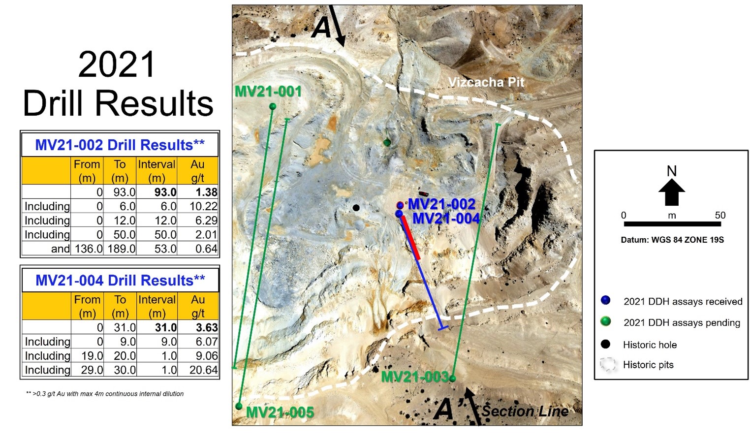 The first batch of analytical results for the program have been received from Andes Analytical Laboratories and correspond to diamond drill holes MV21-002 and MV21-004. The location of the drill holes and a table with a selection of significant gold intercepts* is shown below in Figure 2.