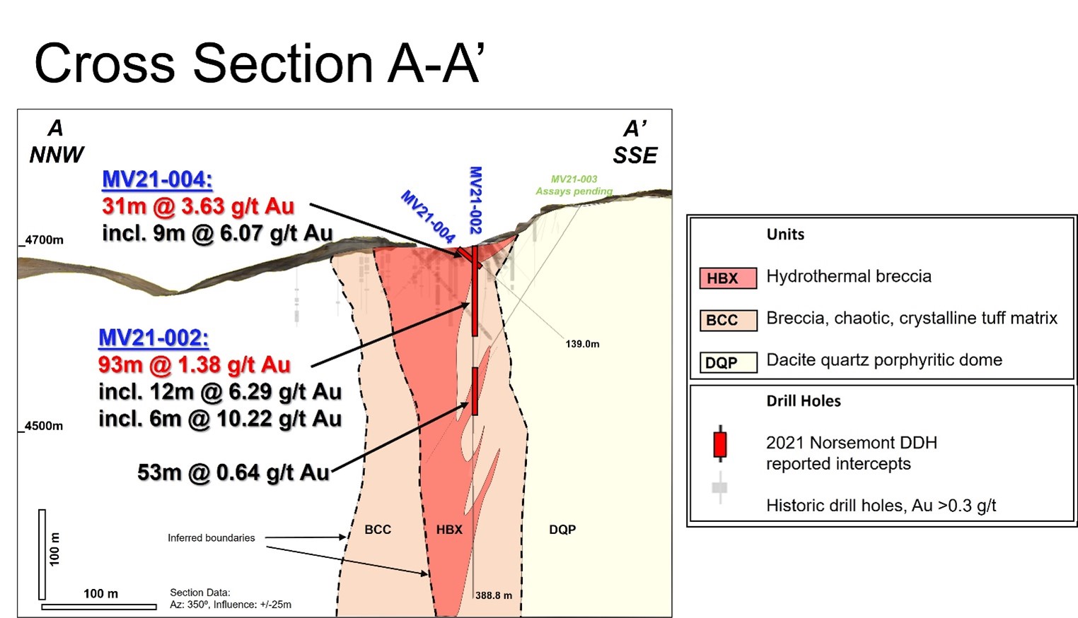 - 3.63 g/t Au over 31.0m from surface including 6.07 g/t Au over 9.0m (MV21-004).