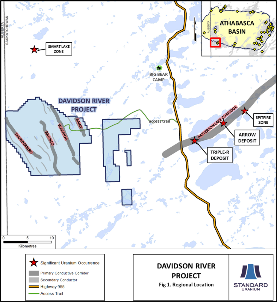 Standard Uranium is a mineral resource exploration company based in Vancouver, British Columbia. Since its establishment, Standard Uranium has focused on the identification and development of prospective exploration stage uranium projects in the Athabasca Basin in Saskatchewan, Canada. Standard Uranium's Davidson River Project, in the southwest part of the Athabasca Basin, Saskatchewan, is comprised of 21 mineral claims over 25,886 hectares. The Davidson River Project is highly prospective for basement hosted uranium deposits yet remains untested by drilling despite its location along trend from recent high-grade uranium discoveries. A copy of the NI 43-101 Technical Report that summarizes the exploration on the Project is available for review under Standard Uranium's SEDAR issuer profile (www.sedar.com).