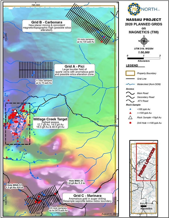 The Pici Target (Exhibit 2) is on the northeast edge of the Witlage gold placer, the largest placer gold deposit on the property. In 2018, prospectors establishing an access trail discovered a boulder field of quartz veins with anomalous gold in rock samples. The quartz boulders are secondary silica alteration, a good indication of prospective hydrothermal alteration that may be associated with bedrock gold mineralization and thought to be the source of gold in nearby placer gold deposits. The size of the boulder field is at least tens of metres in diameter but has yet to be defined and properly sampled by a geologist. An exploration grid consisting of 23 kilometres of baseline and cross lines, covering an area of 2 square kilometers or 200 hectares, will be completed and followed up by geological mapping and auger sampling. Geochemical anomalies would quickly be followed up with diamond drilling.