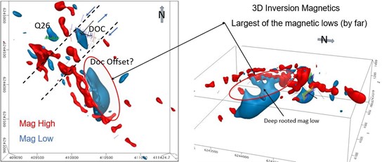 As shown in the figure below, the Q26, Doc and the Doc Offset all exhibit the same low magnetic profile. These zones may have been part of a larger mineralized system that has been offset by strike slip faulting. Current plans are to test this theory during the 2021 exploration program with mapping and sampling and possible drill testing of this deeper seated magnetic low occurrence.