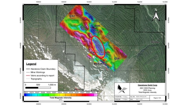 “Management is confident that the results of the UAV Magnetic Survey can assist in the planning of the 2021 exploration and the locations of drill program priority targets. The magnetic signatures appear to be coincidental with the previously known mineralized occurrences and have uncovered previously unexplored potential targets for further evaluation. Hanstone is excited to test the newly interpreted Doc Offset which seems analogous to the mineralized Doc and Q26 areas. We are all looking forward to providing our shareholders with an exciting 2021 drilling and exploration program that is designed to further define potential mineral resources and additional targets for exploration and future development.”