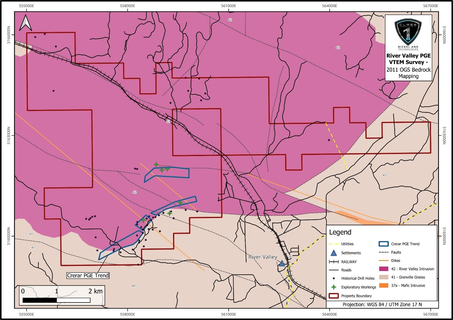 Figure 2. Generalized geology from the southeastern River Valley Intrusion (OGS, 2011), showing the River Valley PGE Property boundary and the location of known sulphide mineralization, PGE-sulphide trends such as the Crerar PGE Trend, and historical drill hole collars.