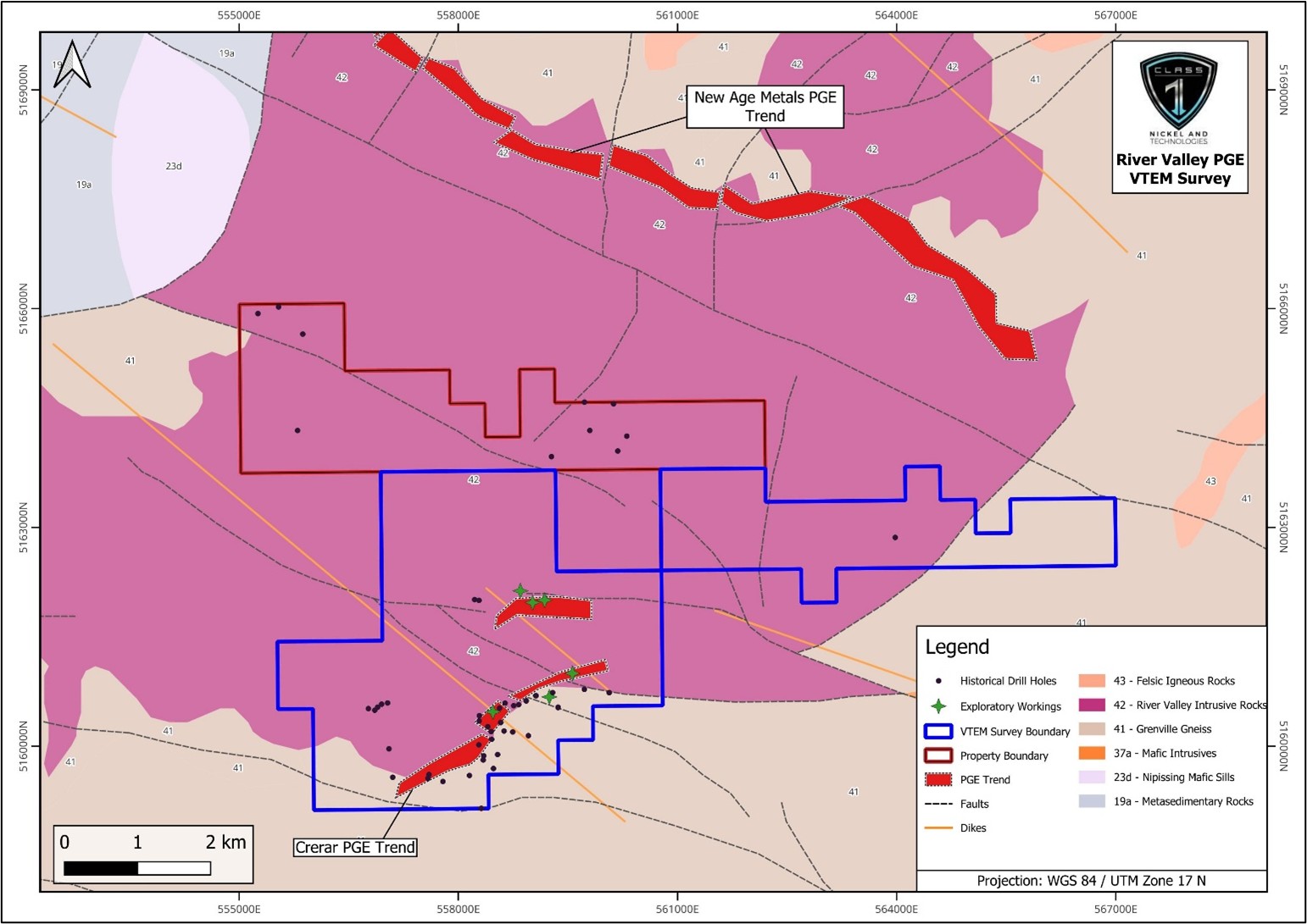 TORONTO, July 09, 2025 (GLOBE NEWSWIRE) -- Class 1 Nickel and Technologies Limited (CSE: NICO | OTCQB: NICLF) ("Class 1” or the "Company") is pleased to announce the launch of its 2025 summer exploration program on its 100%-owned River Valley PGE-Cu-Ni Project (the “RV Project” or the “Property”), located about 65 kilometres northeast of the City of Sudbury, Ontario, Canada. The RV Project covers approximately 2,916 ha, within which lies several kilometres of prospective geology and known PGE-bearing sulphide mineralization categorized as Contact-Style PGE-Cu-Ni and hosted by the River Valley Intrusion (“RVI”). The RV Project is immediately south of the advanced River Valley Palladium Project being developed by New Age Metals Inc.