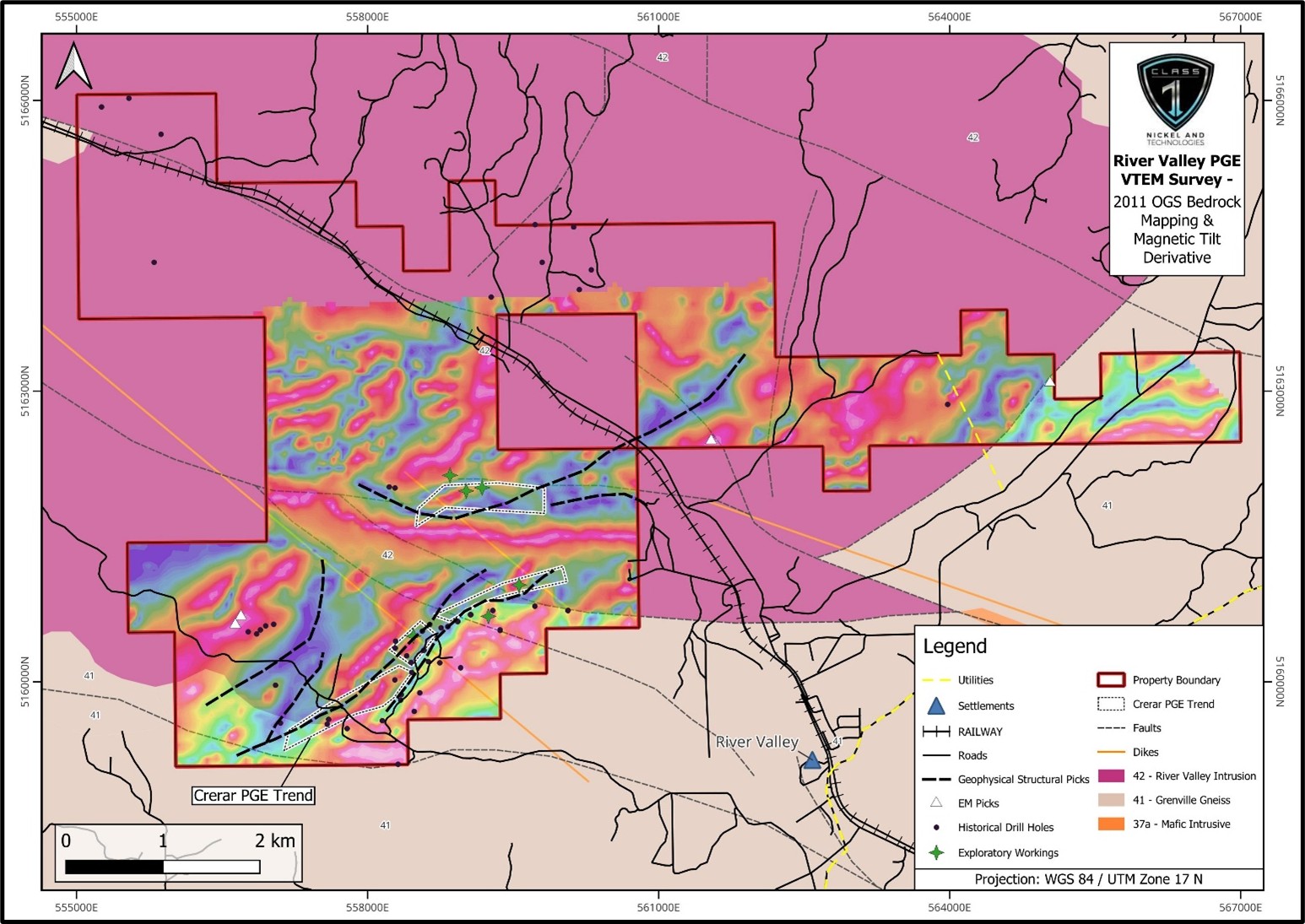 Figure 3. Magnetic Tilt Angle Derivative overlain on the generalized geology from the southeastern River Valley Intrusion (OGS, 2011), showing the location of the River Valley PGE Property boundary, location of known sulphide mineralization, PGE-sulphide trends such as the Crerar PGE Trend, historical drill hole collars, and geophysical (EM and structural) picks. The Geophysical Structural Picks represent some of the new trends that will be ground-truthed during this summer’s field program