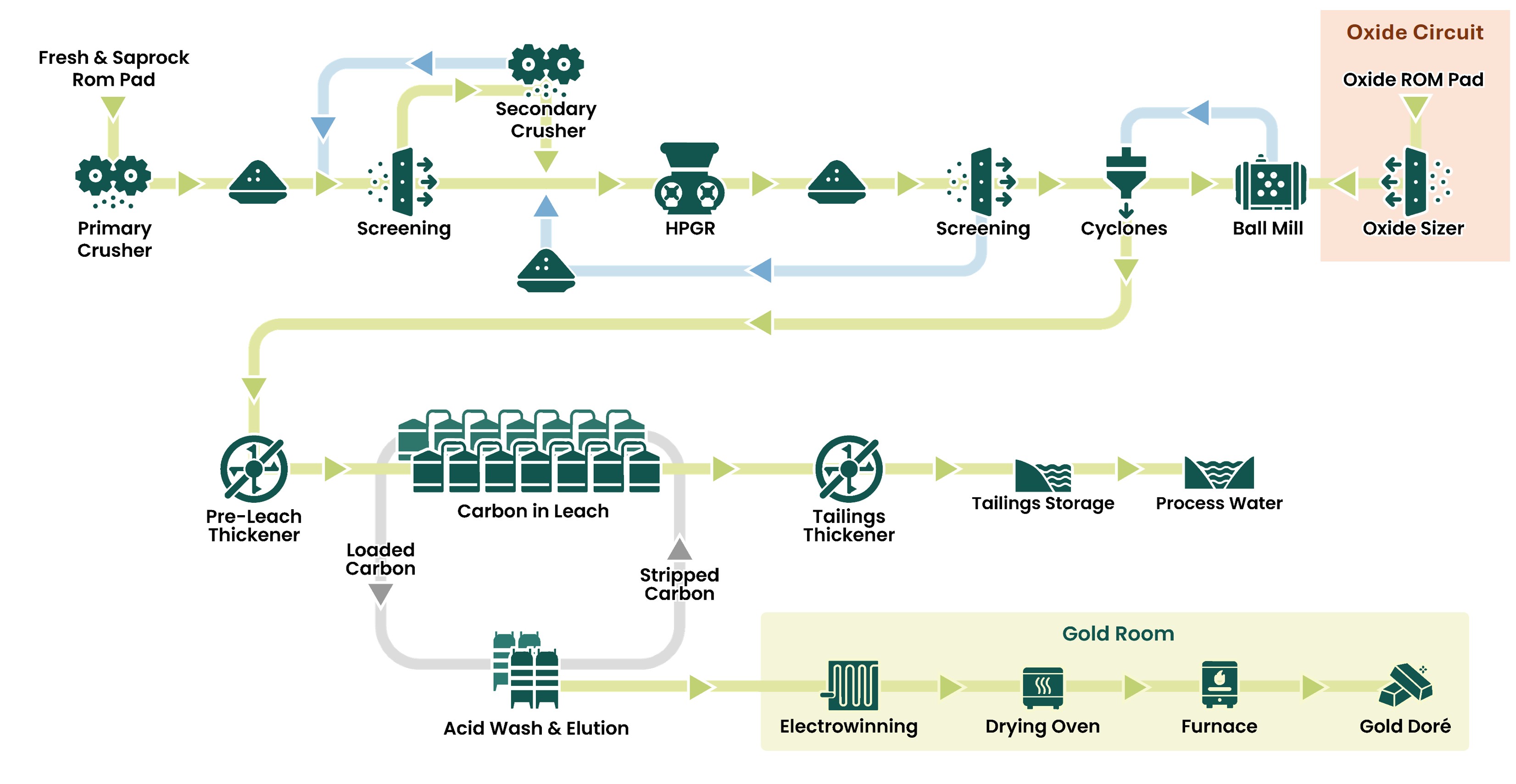 - Addition of an oxide circuit to allow processing of 100% oxide feed is expected to provide enhanced operational flexibility, improve plant availability and utilisation, lower oxide pre-stripping and rehandling requirements thereby reducing working capital outflows, and provide the potential to advance first gold pour and thereby reduce the peak upfront capital requirement.