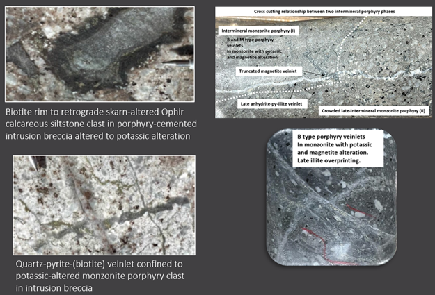 - Both drill holes intersected porphyry systems defined by at least three late-mineral monzonite porphyritic intrusive phases and an intrusion breccia over a vertical depth of approximately 1,500 m (see Figure 3).