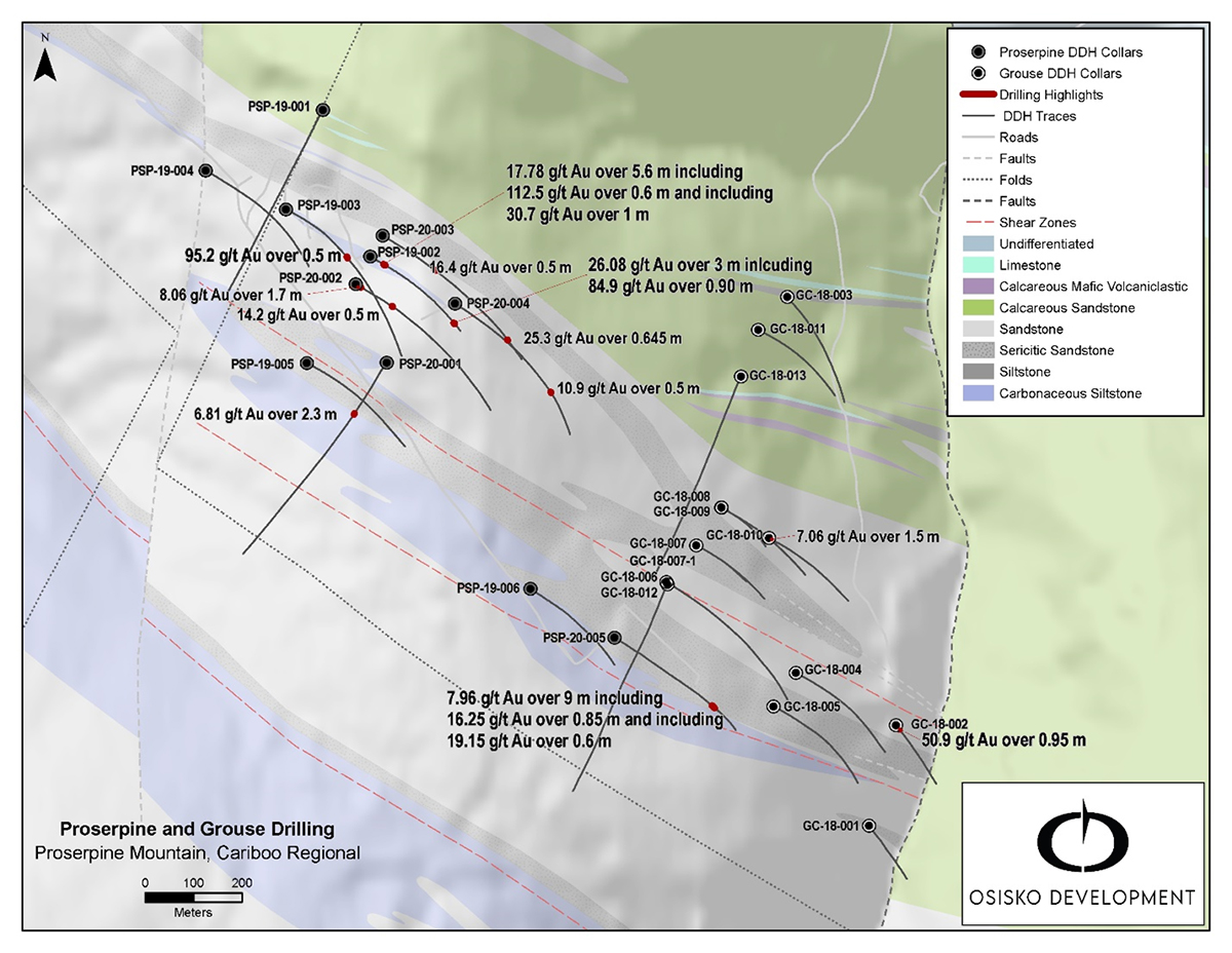 Detailed geologic mapping and sampling programs carried out in 2019 identified several prospective drill targets and further defined the lithologic controls on gold mineralization of the Company’s greenfield targets (Figure 1). The initial program was successful in discovery of high-grade, mineralized axial planar veins analogous to those on Cow, Island and Barkerville Mountains with assay highlights of 17.78 g/t Au over 5.60 meters including a sample of 112 g/t Au over 0.60 meter and 30.70 g/t Au over 1.00 meter in hole PSP-19-002 (See Osisko Gold Royalties Ltd news release dated October 5th, 2020). The Proserpine area is located six kilometers along trend from the Cariboo Deposits and minimal drill testing has occurred along the trend to date (Figure 2).