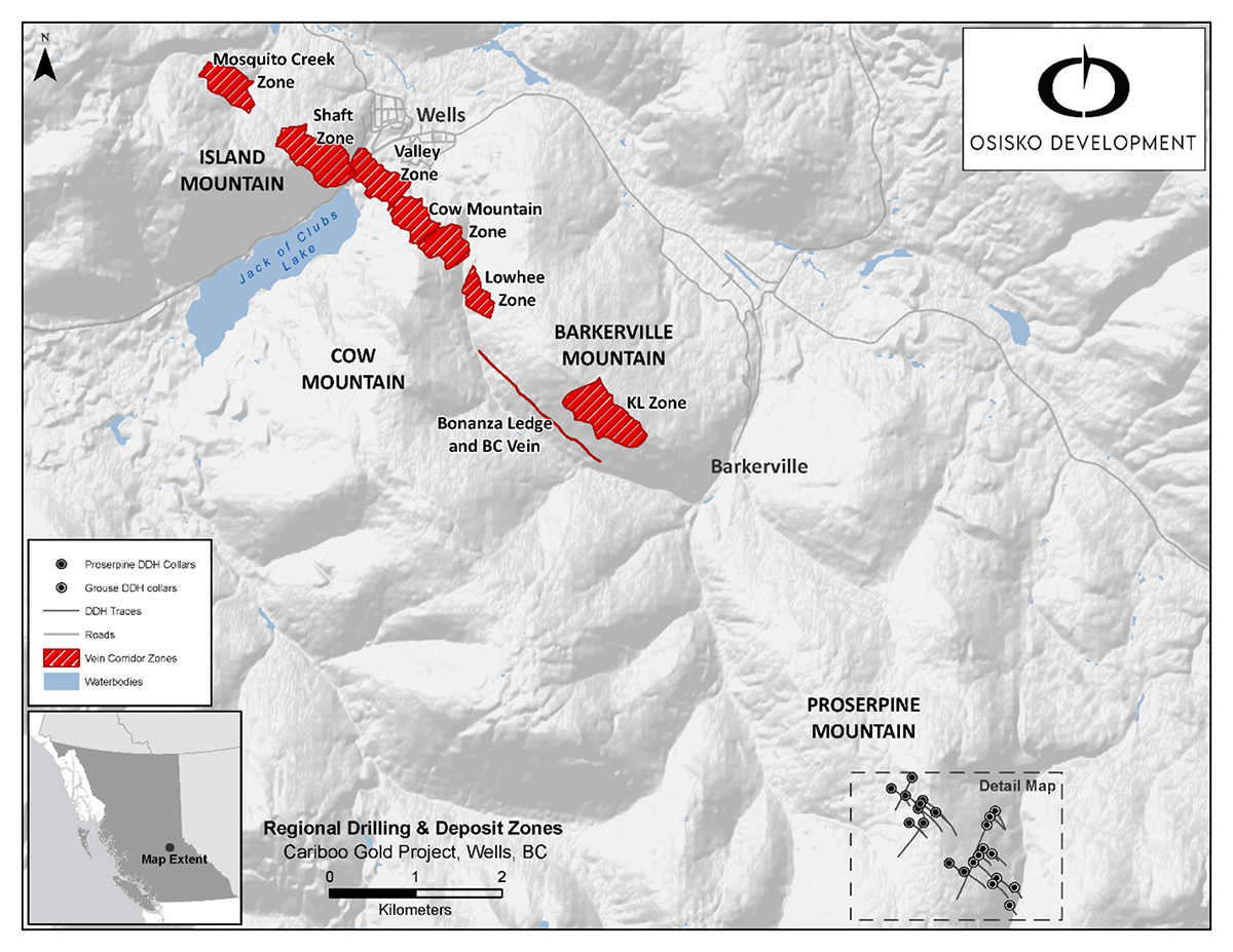 Sean Roosen, Chair and CEO of Osisko, commented: “The success of these initial drill holes located six kilometers south east of the Company’s Mineral Resource, continue to increase the confidence we have in the potential scale of the mineralized trend on the Cariboo mining camp.”