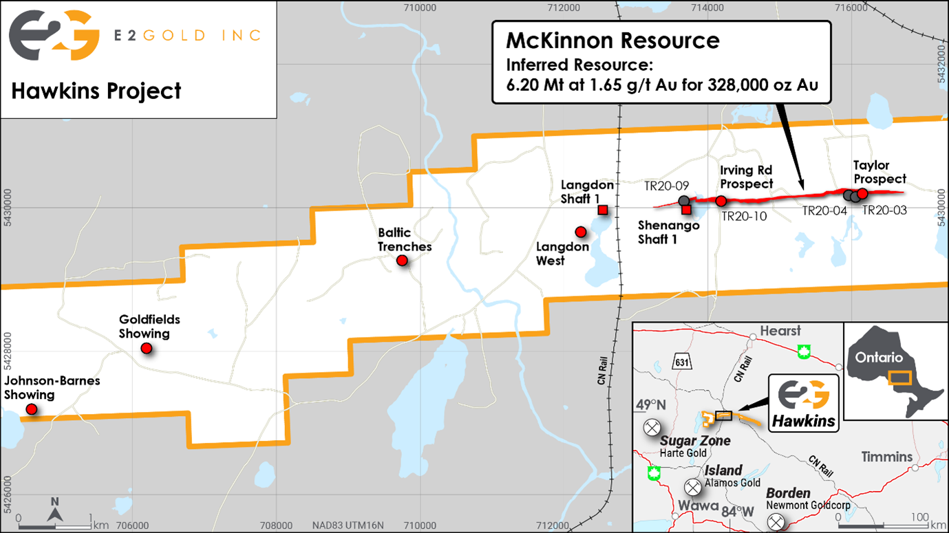 E2Gold Inc. is a Canadian gold exploration company which recently completed an overbought Initial Public Offering, listing on the TSX Venture Exchange. Its large flagship property, the Hawkins Gold Project, covers 7 townships in north-central Ontario, about 140 km east of Hemlo. The McKinnon Zone is an at surface, NI43-101 Inferred Mineral Resource of 6.2 million tonnes grading 1.65 g/t for 328,800 ounces of gold. The Company has all relevant permits in place to complete its planned program.