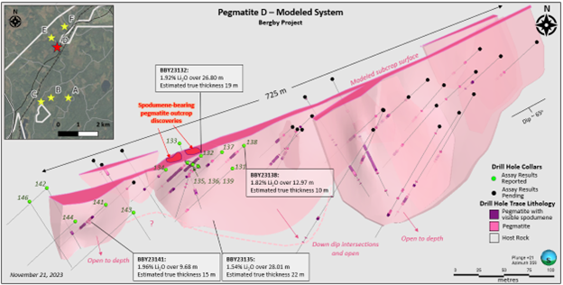 Figure 1: Bergby Project modelled Pegmatite D system and drill hole locations, as of November 21, 2023.