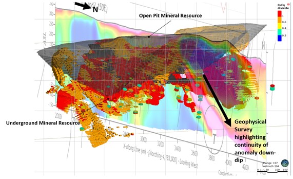 Attachment 2 – Isometric view showing Current Lomero Resource in relation to the geophysical (electromagnetic) anomaly