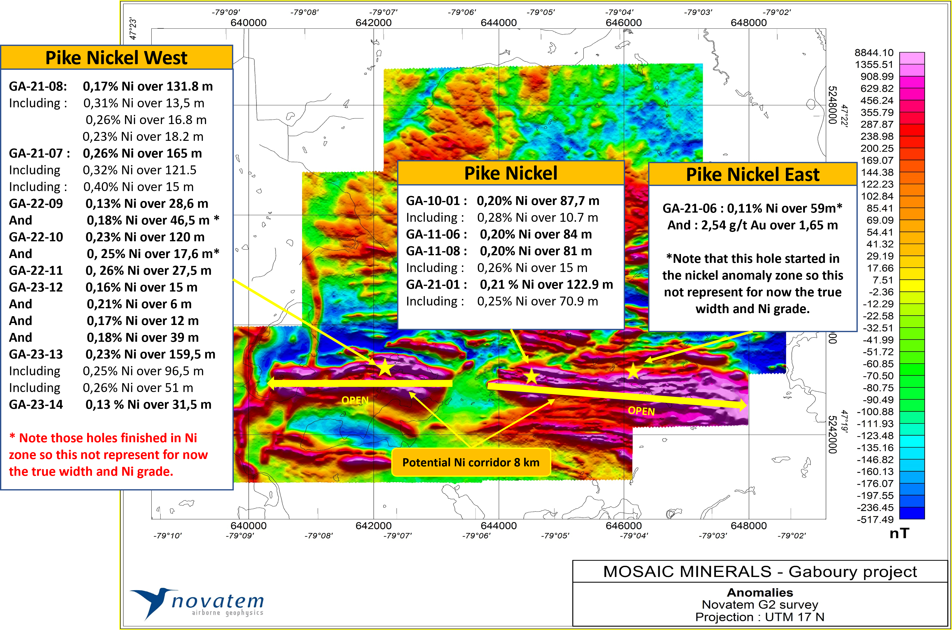 “We are very satisfied with these preliminary results and are confident of obtaining other equally encouraging analysis results shortly. Our technical team believes that there could be nickel enrichment traps deeper or along the various magnetic anomalies with a length of nearly 8 km identified in the southern part of the Gaboury project,” underlines Mr. Jonathan Hamel, President, and CEO of Mosaic.