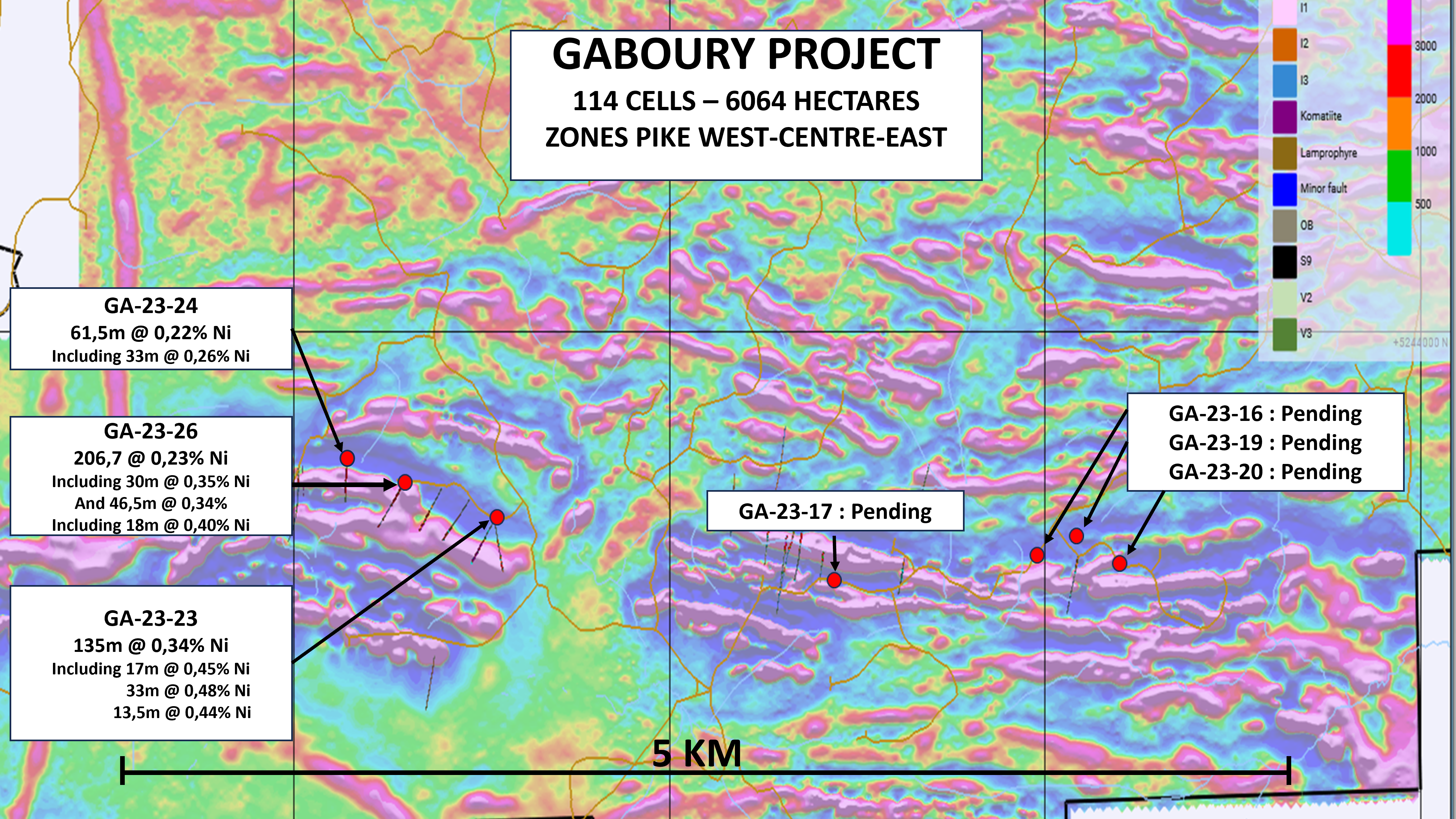 - GA-23-16 and GA-23-20 confirm the nickel potential of the East Pike zone by intersecting ultramafic units with thicknesses varying from 45.0 to 84.0 m (analyses in progress).