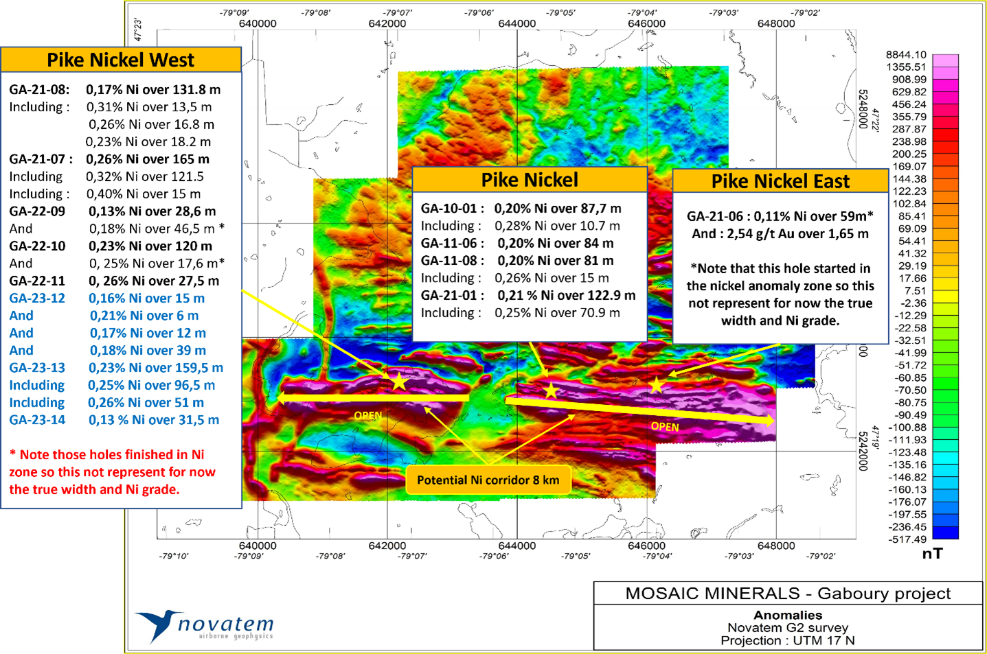 MONTREAL, April 04, 2024 (GLOBE NEWSWIRE) -- Mosaic Minerals Corporation (CSE: MOC) (“Mosaic” or “The Company”) announces the remaining results of the work program consisting of eight drillings carried out in December 2023 for a total of 2,484 meters on the Gaboury project.