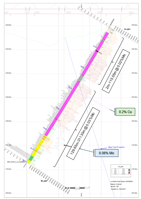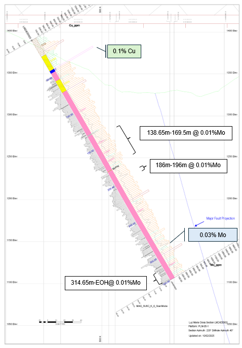 - The drill program has successfully proved that both the intrusive rocks, diorite in drill holes LM24DD001 and LM24DD002, quartz-monzonite in drill hole LM24DD003 and the sedimentary wall rock, all host homogeneous copper-molybdenum mineralization (refer to figures 3, 4, and 5) consistently along the length of the drill holes (400 ppm Cu and 100 ppm Mo in LM24DD001, 450ppm Cu and 100 ppm Mo in LM24DD002, and 350ppm Cu and 80 ppm Mo in LM24DD003), albeit in subeconomic quantities.