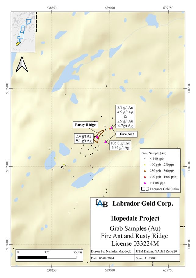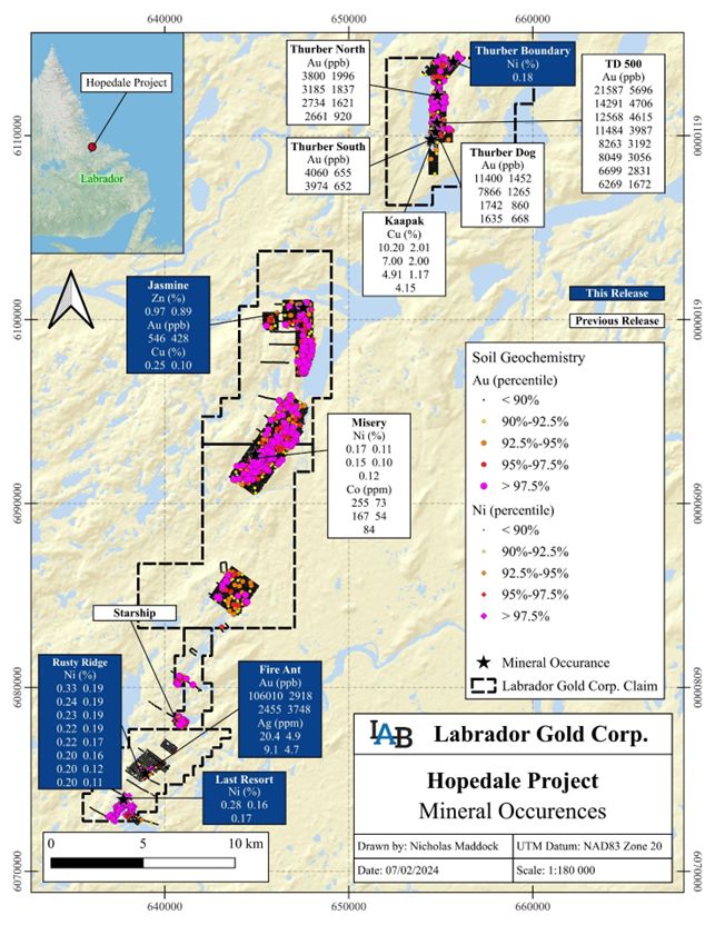 “Our 2023 exploration program over the district scale Hopedale property confirmed the significant prospectivity of the Rusty Ridge area for nickel associated with ultramafic rocks and identified a new area, Last Resort, with similar potential for magmatic sulphide type mineralization,” said Roger Moss, President and CEO of Labrador Gold. “The highest grade gold found on the property to date, 106g/t Au and 20.4g/t Ag, was sampled at a new occurrence, Fire Ant, in the Rusty Ridge area and brings the number of significant gold occurrences on the property to five. Potential for zinc-rich volcanogenic massive sulphide was identified at Jasmine as well as a significant copper in soil anomaly at Thurber Boundary. Work conducted by LabGold at Hopedale demonstrates that the Florence Lake greenstone belt contains many of the same mineralization styles seen in some of the most productive greenstone belts elsewhere in the world.”
