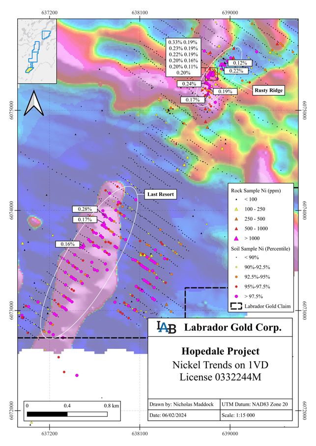 Figure 2. Highlights of nickel in soil and rock samples over Rusty Ridge and Last Resort Occurrences.