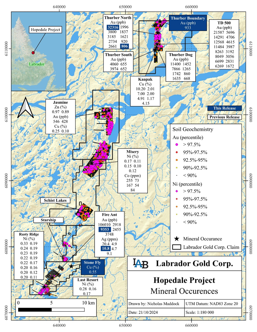 TORONTO, Oct. 24, 2024 (GLOBE NEWSWIRE) -- Labrador Gold Corp. (TSX.V:LAB | OTCQX:NKOSF | FNR: 2N6) (“LabGold” or the “Company”) is pleased to announce the results of the 2024 exploration program at its 100% owned Hopedale Project in Labrador. The district scale Hopedale property covers a 43km strike length of the Archean-age Florence Lake greenstone belt which has characteristics typical of greenstone belts around the world but has been underexplored by comparison.