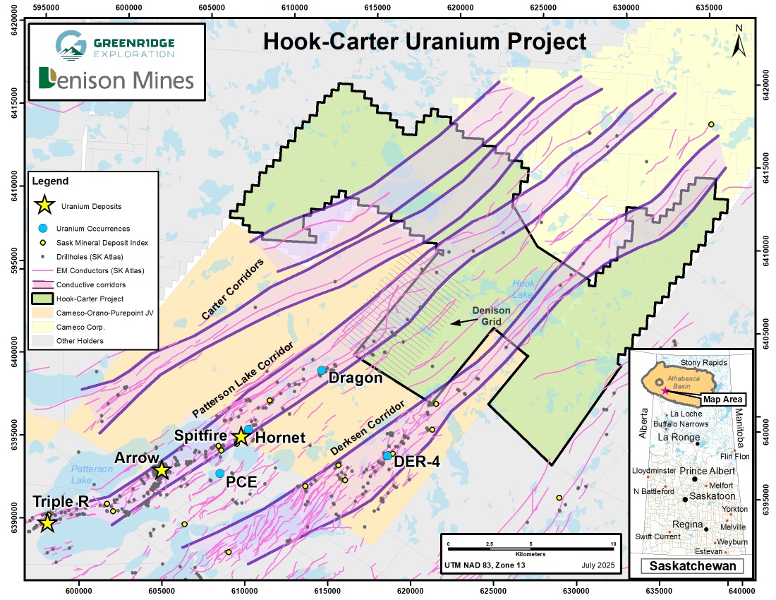 VANCOUVER, British Columbia, July 16, 2025 (GLOBE NEWSWIRE) -- Greenridge Exploration Inc. (“Greenridge” or the “Company”) (CSE: GXP | FRA: HW3 | OTCQB: GXPLF), is pleased to announce the commencement of a work program (the “Program”) at its Hook-Carter Uranium Project (“Hook-Carter”, or the “Property”) located in the southwestern Athabasca Basin region of Saskatchewan, Canada. Exploration at Hook-Carter is operated by Denison Mines Corp. (“Denison”) and the Property is owned 20% by Greenridge and 80% by Denison. The Program consists of a moving loop time-domain electromagnetic (“MLTDEM”) ground geophysical survey to identify new drill targets along the highly-prospective Patterson Lake Corridor, which is host to multiple significant existing uranium deposits.