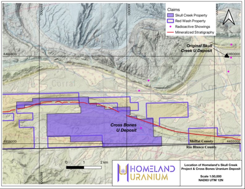 "The addition of the Cross Bones Uranium Deposit on the Skull Creek Property is a tremendously exciting acquisition for Homeland. Strategically located in close proximity to our Coyote Basin Project in mining-friendly Colorado, we anticipate Skull Creek providing significant potential operational synergies with Coyote Basin and further strengthens our position in the district. With a dominant land package containing two considerable historical uranium deposits with outstanding expansion potential, Homeland is eager to start drilling at both Coyote and Skull Creek to systematically upgrade these deposits to modern standards and become a key part of the urgently needed resurgence of domestic uranium supply chain in the United States," stated Roger Lemaitre, President & CEO of Homeland.