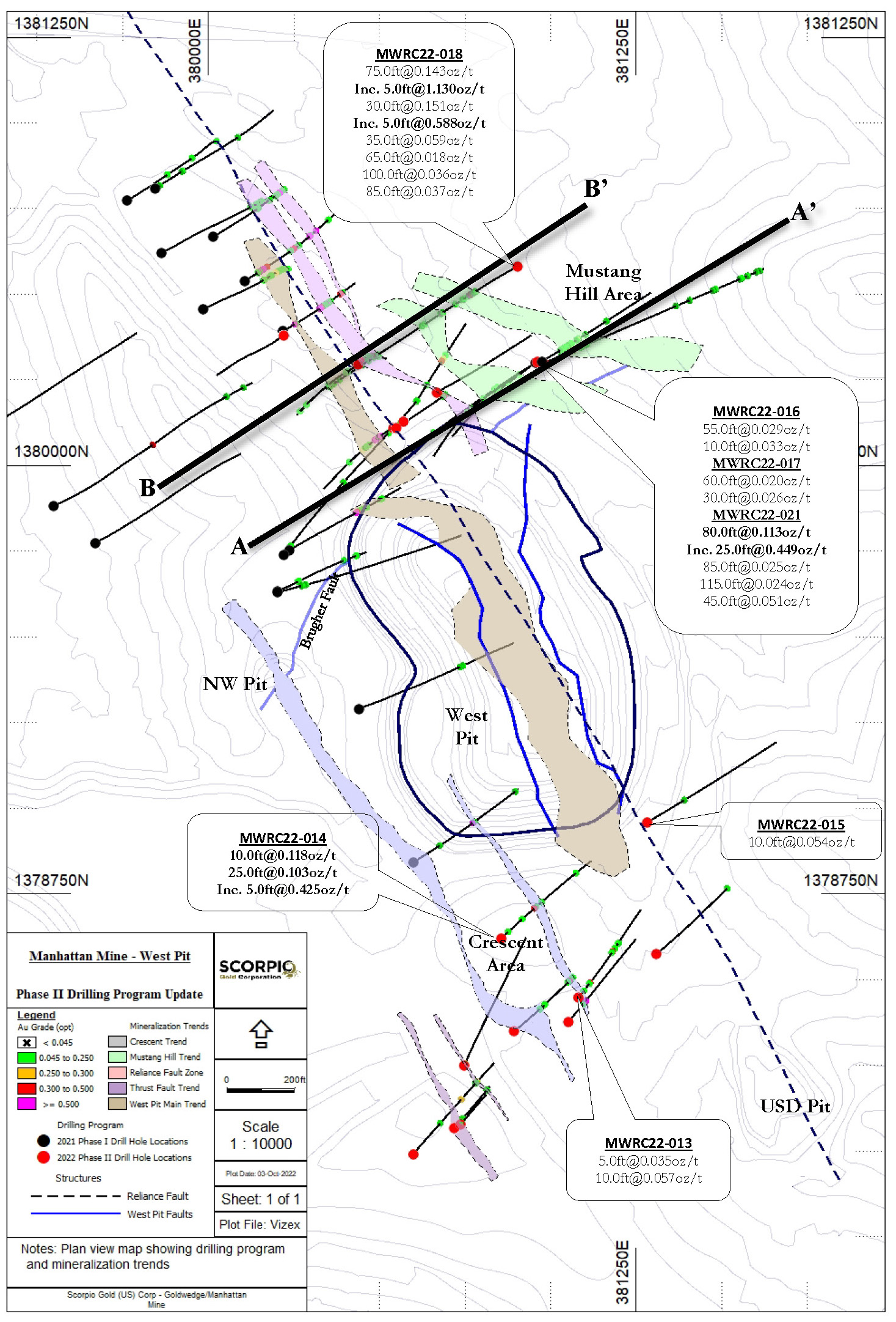 VANCOUVER, British Columbia, Oct. 06, 2022 (GLOBE NEWSWIRE) -- Scorpio Gold Corporation (“Scorpio Gold” or the “Company”) (TSXV: SGN) is pleased to announce updated significant intercepts for Phase II reverse circulation (RC) drilling program at its Goldwedge property located in Manhattan, Nevada.