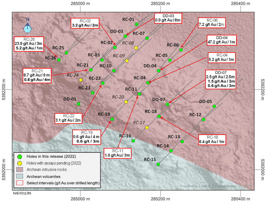 - 8.7 g/t Au over 9 m (RCFON22-021), including 22.2 g/t Au over 3 m
