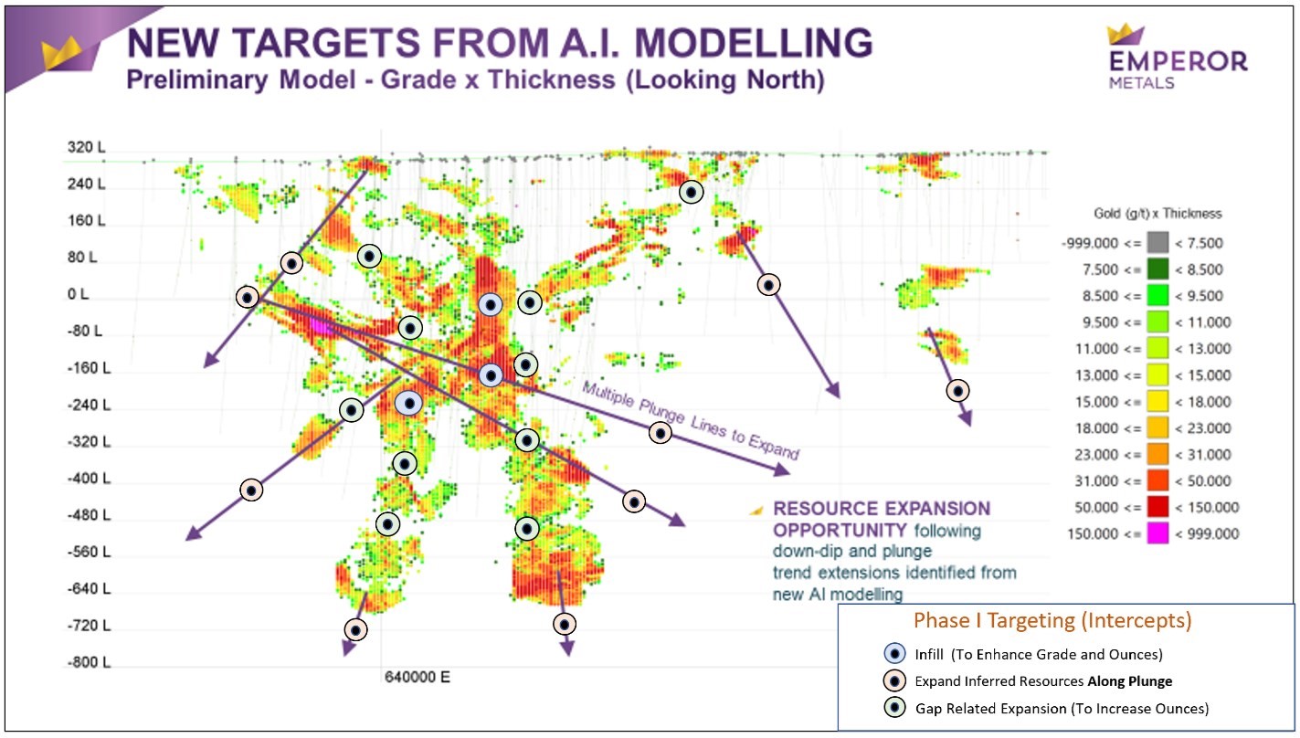 “Emperor has now appended to the existing Artificial Intelligence (A.I.) Model by incorporating a newly developed A.I. 3D Geological Model into our previous A.I. Mineralized Model. By developing both a mineralized and geological model using A.I., it has illuminated a plethora of targets to expand the existing historical resource1,2. These models were swiftly developed compared to conventional techniques due to A.I. agility to process complex information. This efficiency promotes the project quickly and gives us a more holistic understanding of drillhole design for resource expansion; by illuminating potential patterns for resource expansion targeting high-grade zones.”