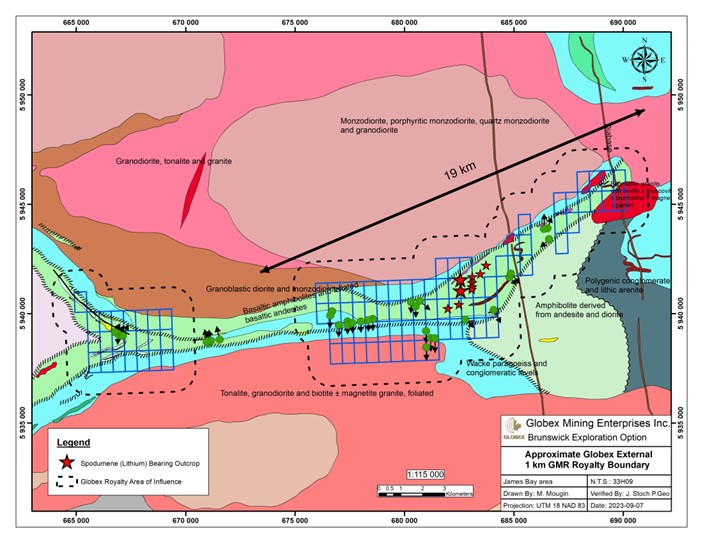ROUYN-NORANDA, Quebec, Sept. 08, 2023 (GLOBE NEWSWIRE) -- GLOBEX MINING ENTERPRISES INC. (GMX – Toronto Stock Exchange, G1MN – Frankfurt, Stuttgart, Berlin, Munich, Tradegate, Lang & Schwarz, LS Exchange, TTMzero, Düsseldorf and Quotrix Düsseldorf Stock Exchanges and GLBXF – OTCQX International in the US) is pleased to inform shareholders that Brunswick Exploration Inc. (BRW-TSXV) have begun a minimum 5,000 metre drill program on the Lac Escale (Mirage) property under option from Globex. The 26-hole drill program will test continuity and widths of the six widest spodumene bearing pegmatite dykes that have been discovered to date on the property over a cumulative strike length of 2,500 metres. Previously Brunswick indicated that these dykes outcropped in widths of up to 80 metres. Prospecting has also identified additional spodumene-bearing outcrops approximately 4.5 km northeast of the center of the previously defined dyke field. The trend of the mineralized dykes now extends for about 6 kilometres with the boulder field extending for an additional 2.7 kilometres to the southwest. Both the extent of the outcrops and boulder train remain open in all directions.