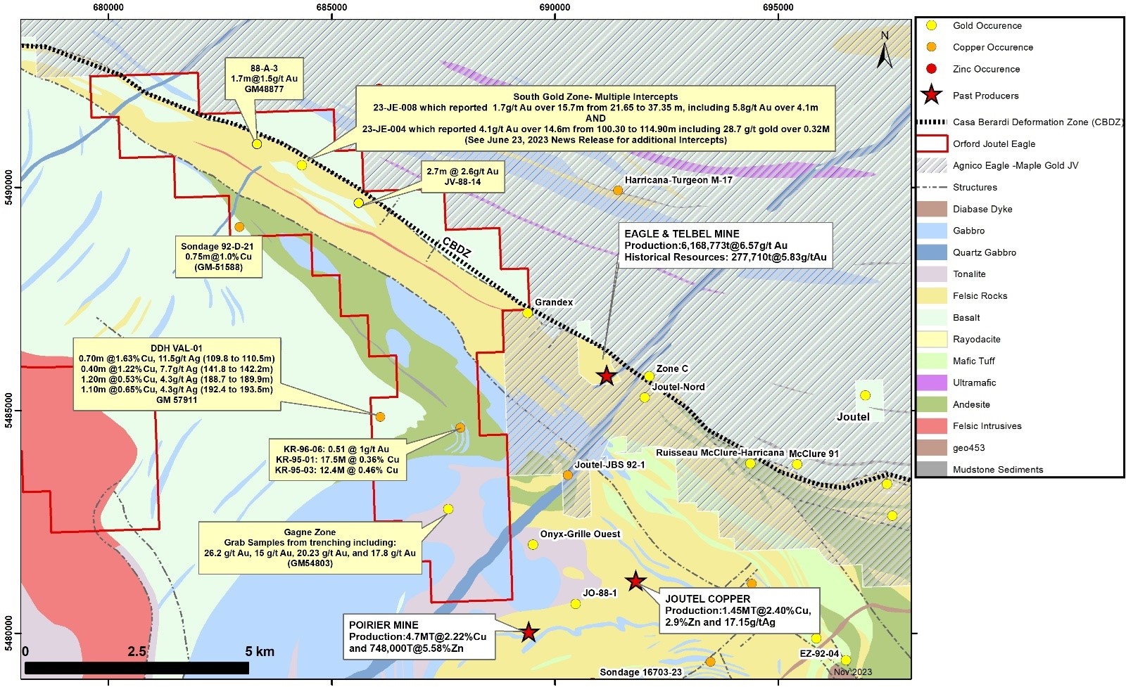 ROUYN-NORANDA, Quebec, Nov. 30, 2023 (GLOBE NEWSWIRE) -- GLOBEX MINING ENTERPRISES INC. (GMX – Toronto Stock Exchange, G1MN – Frankfurt, Stuttgart, Berlin, Munich, Tradegate, Lang & Schwarz, LS Exchange, TTMzero, Düsseldorf and Quotrix Düsseldorf Stock Exchanges and GLBXF – OTCQX International in the US) is pleased to inform shareholders that Orford Mining Corp. (ORM-TSXV) has renewed the option (second anniversary) of Globex’s Joutel Eagle Property in Joutel township, Quebec. Under terms of the agreement, Orford has paid Globex $125,000 and issued 2,500,000 Orford shares to Globex.