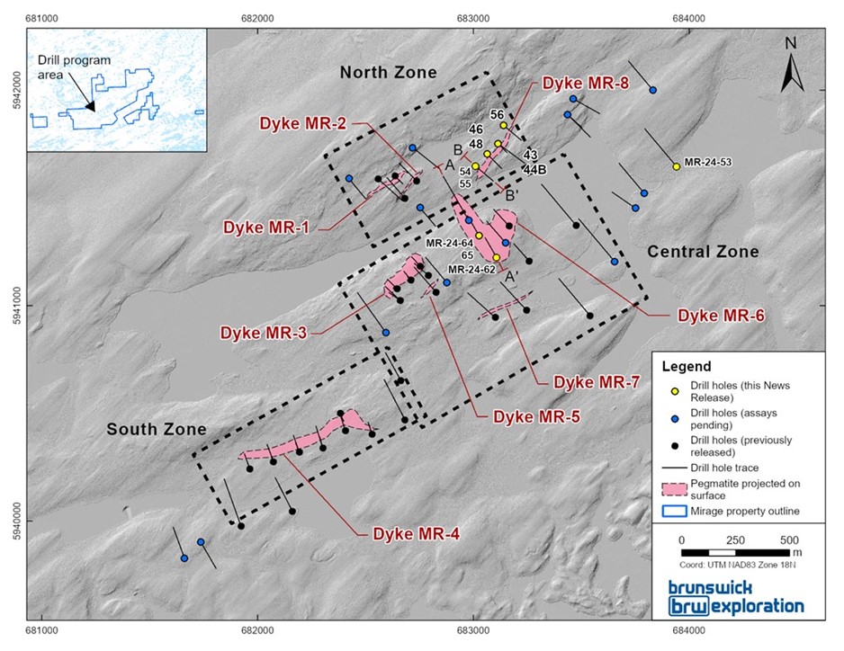 ROUYN-NORANDA, Quebec, May 10, 2024 (GLOBE NEWSWIRE) -- GLOBEX MINING ENTERPRISES INC. (GMX – Toronto Stock Exchange, G1MN – Frankfurt, Stuttgart, Berlin, Munich, Tradegate, Lang & Schwarz, LS Exchange, TTMzero, Düsseldorf and Quotrix Düsseldorf Stock Exchanges and GLBXF – OTCQX International in the US) is pleased to inform shareholders that Brunswick Exploration Inc. (BRW-TSXV, BRWXF-OTCQB) has reported additional significant Li2O intersections on Globex’s Lac Escale (Mirage Project) royalty claims in the Eeyou Istchee – James Bay Region of Quebec. Intersections of up to 1.55% Li2O over 93.45 m and 1.05% Li2O over 34.05 m were encountered.